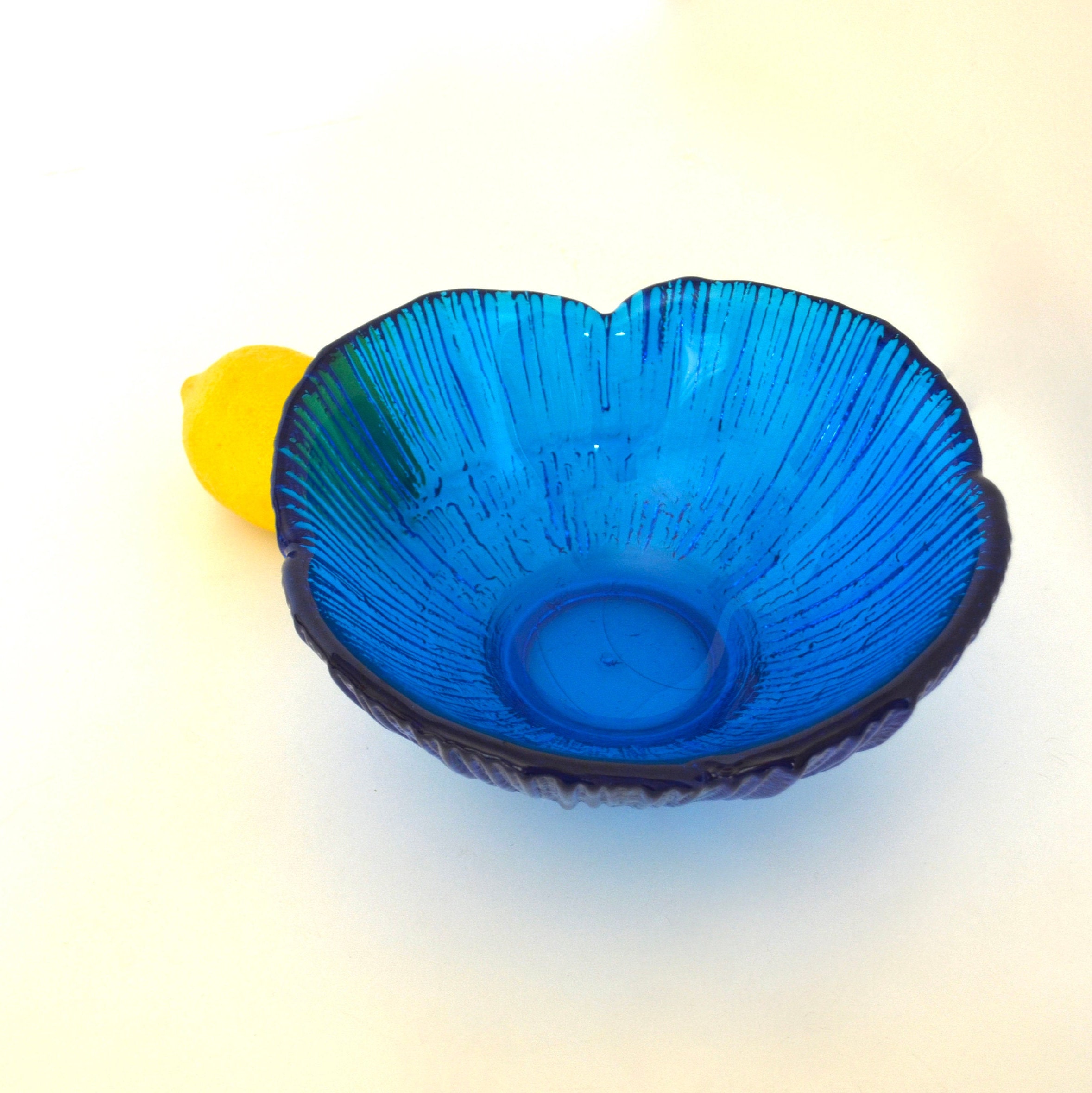 Stunning deep blue glass bowl that resembles the work of Scandinavian designers Pertti Kallioinen and Tauno Wirkkala. Made of thick glass, this piece has a hi low top edge and a ridged bark like texture on the exterior.
