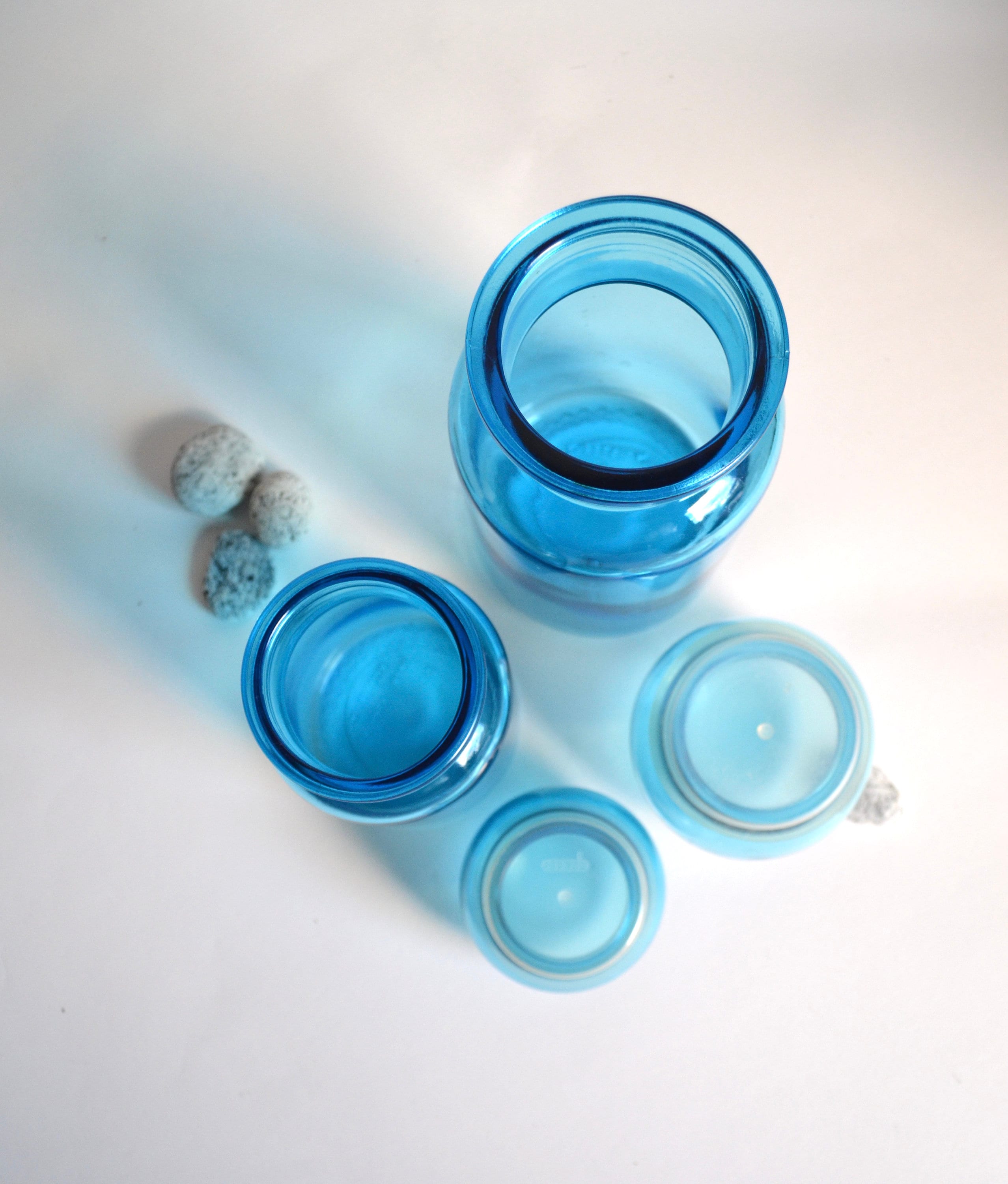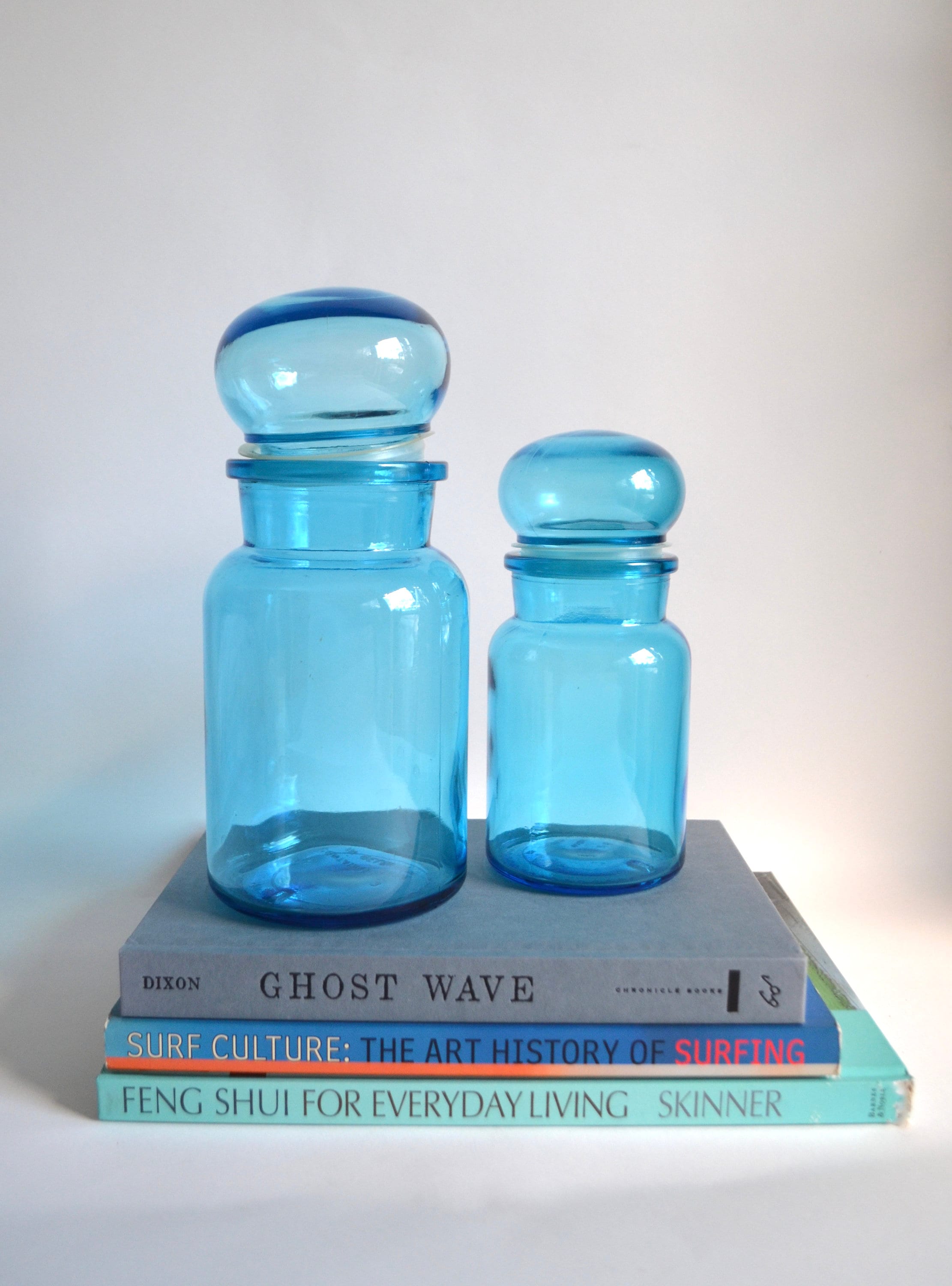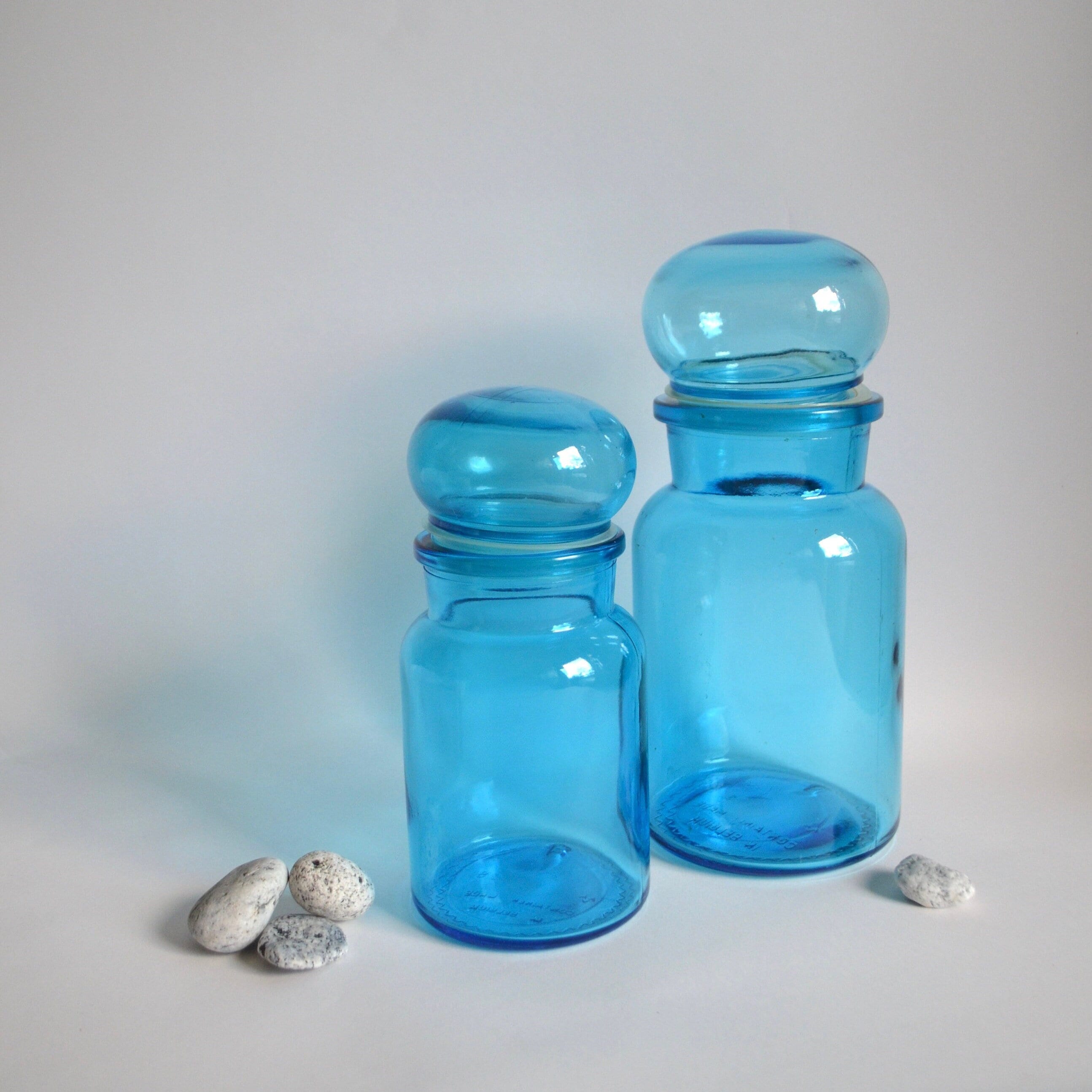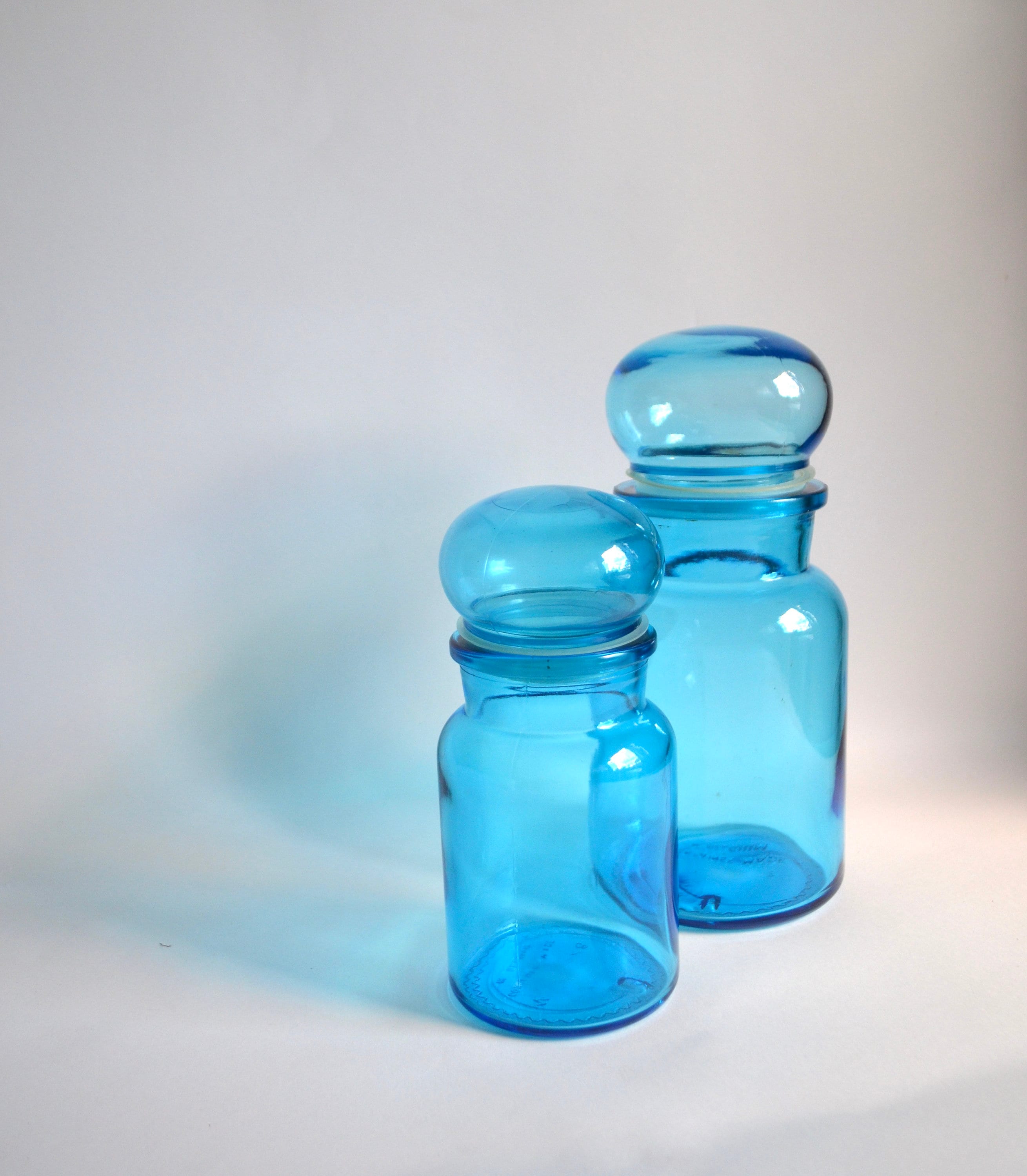 A great pair of fabulous vintage aqua glass containers with mushroom cap domed lids. Super fun retro shaped canisters to store spices and things in the kitchen or soaps and cotton balls in the bathroom.