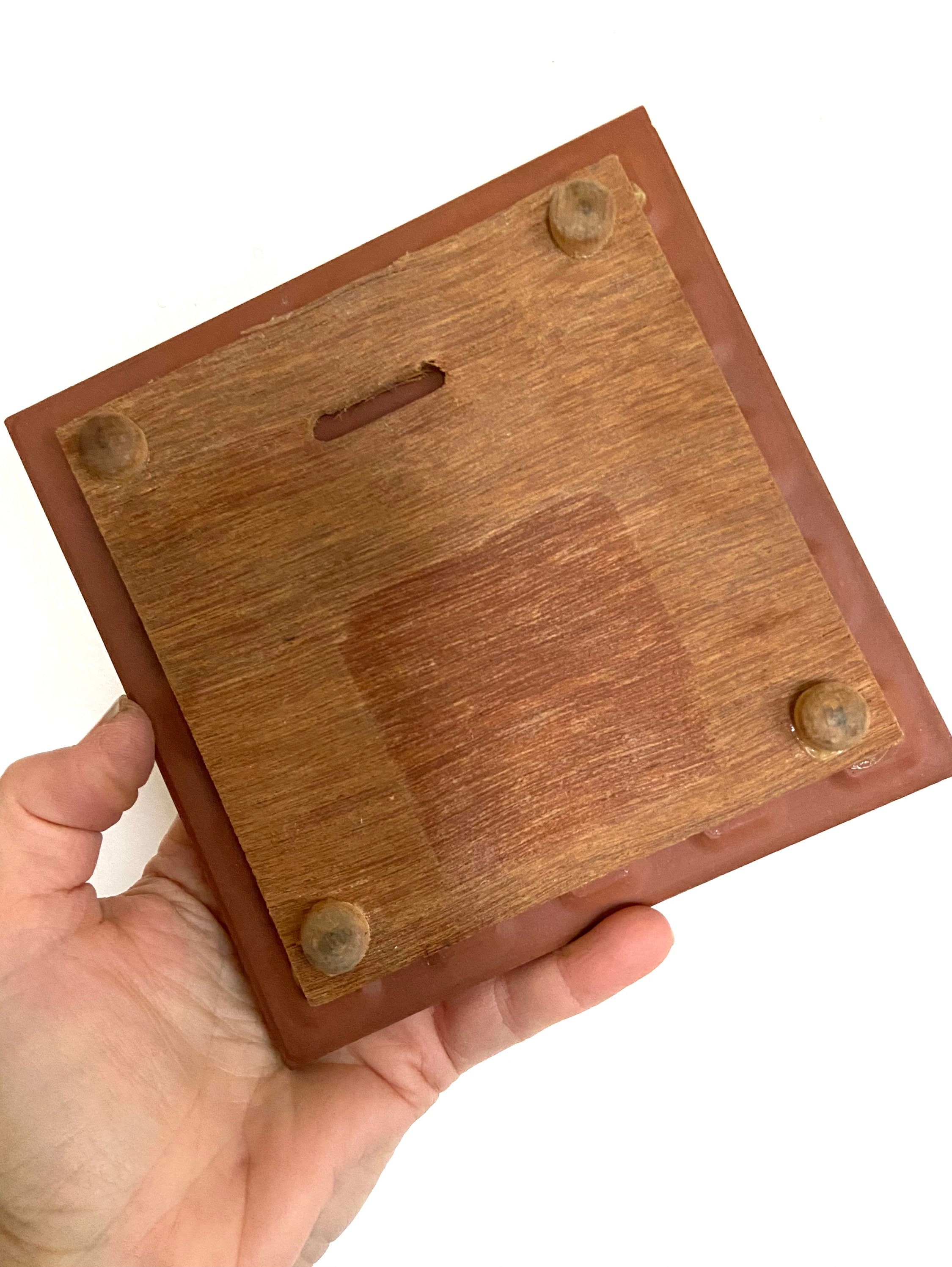 It measures 6" square and is 1" high. In good vintage condition. No chips or cracks. A few small scratches in the glaze. Handcrafted in Italy is our best guess based on others we found. Sticky label is missing from the back.
