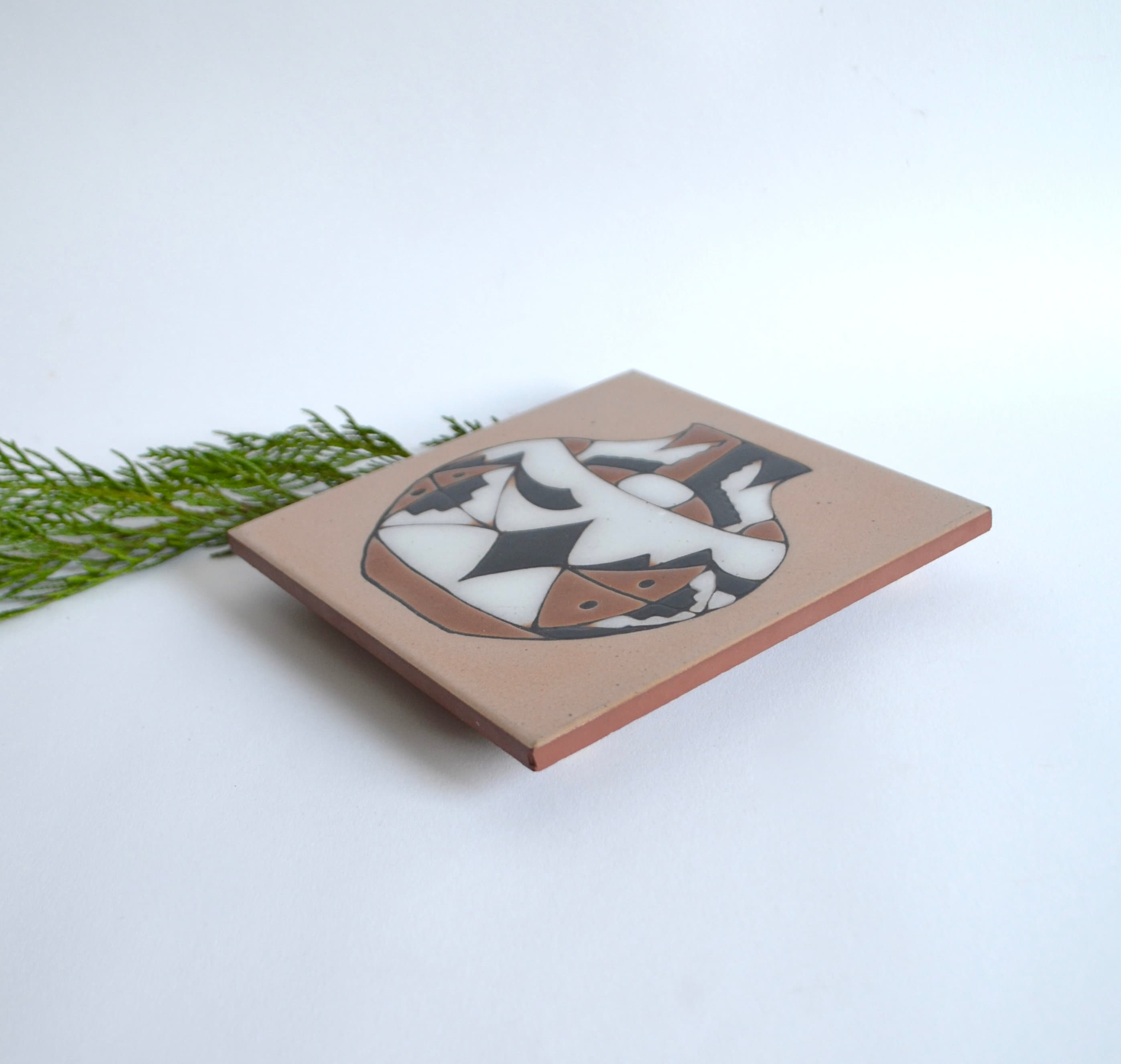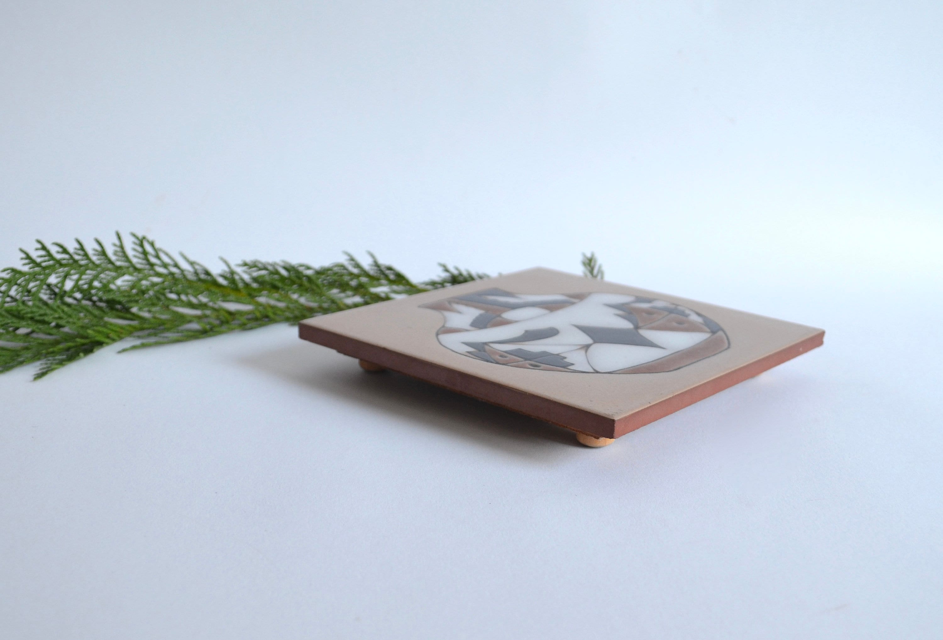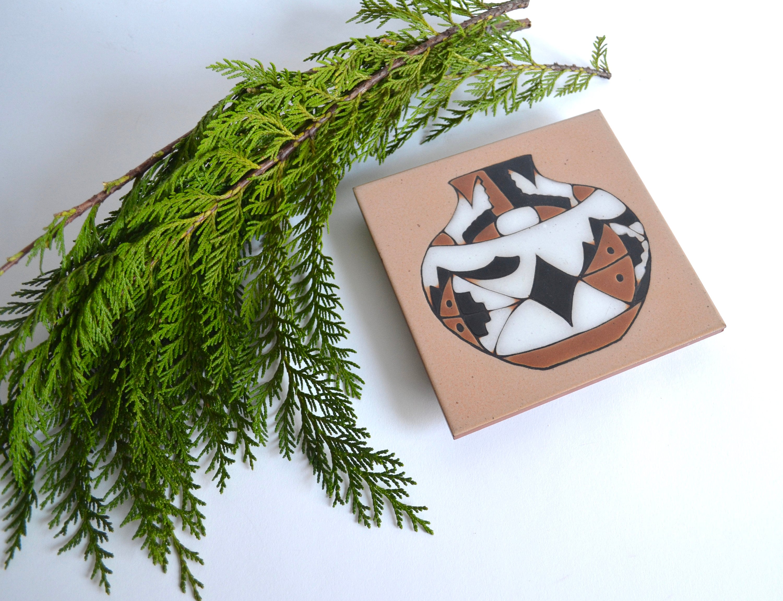 With a boho design of an Acoma Pueblo pottery pot, this cool vintage trivet will protect your countertops and dining table. Wooden button feet at each corner.