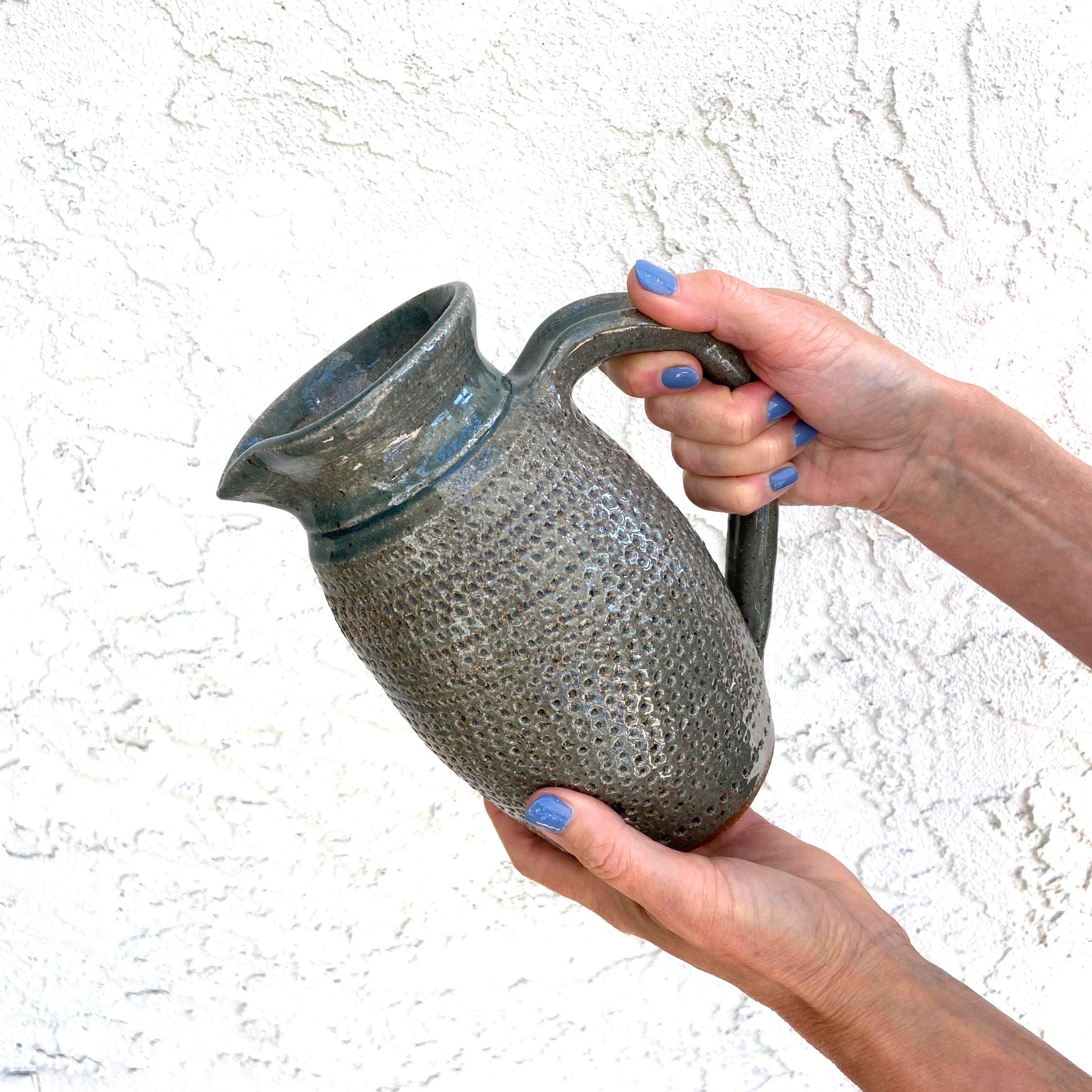 This vintage studio pottery pitcher has a beautiful stippled exterior, giving it a unique texture. Lovely to look at and to hold. All over gray blue glossy glaze.