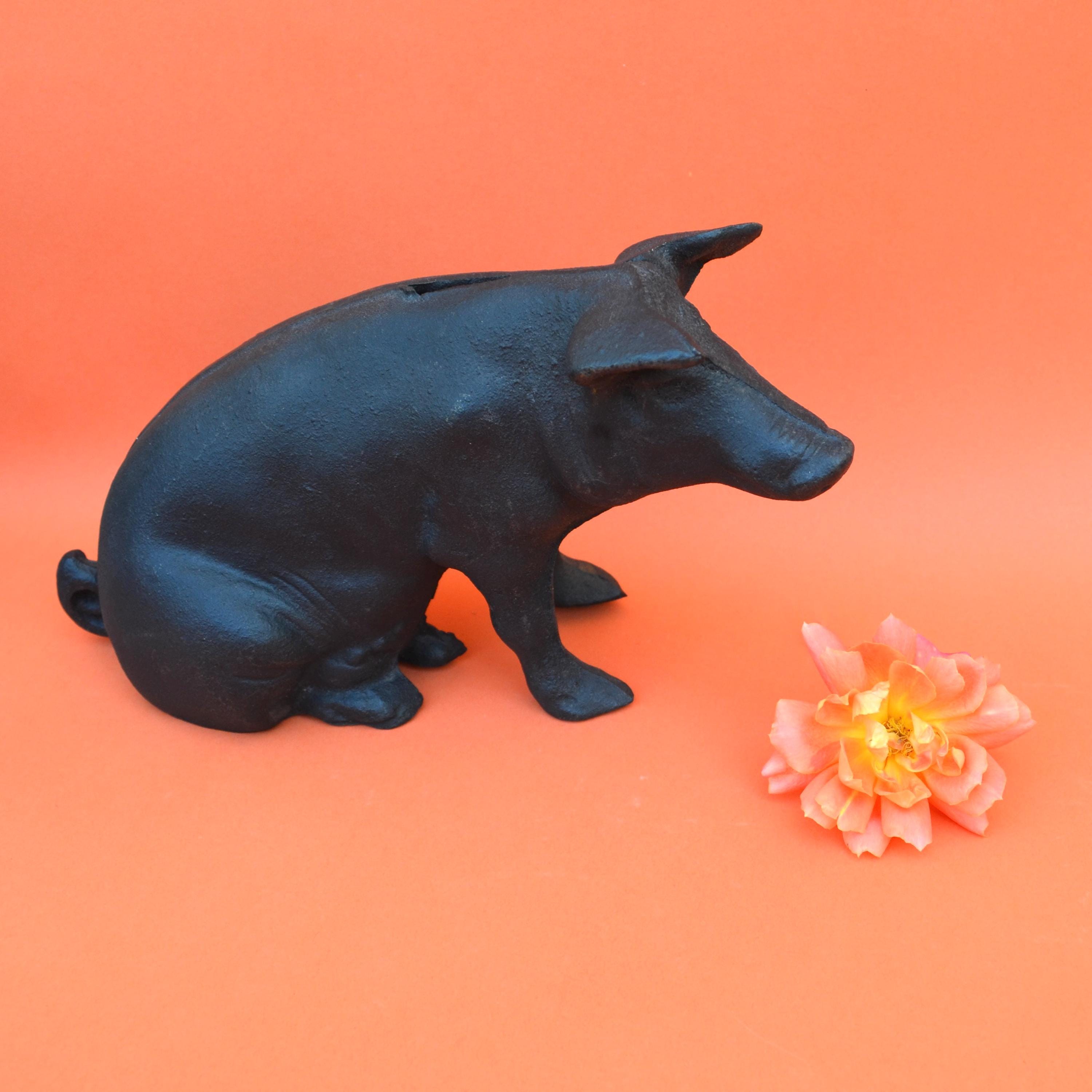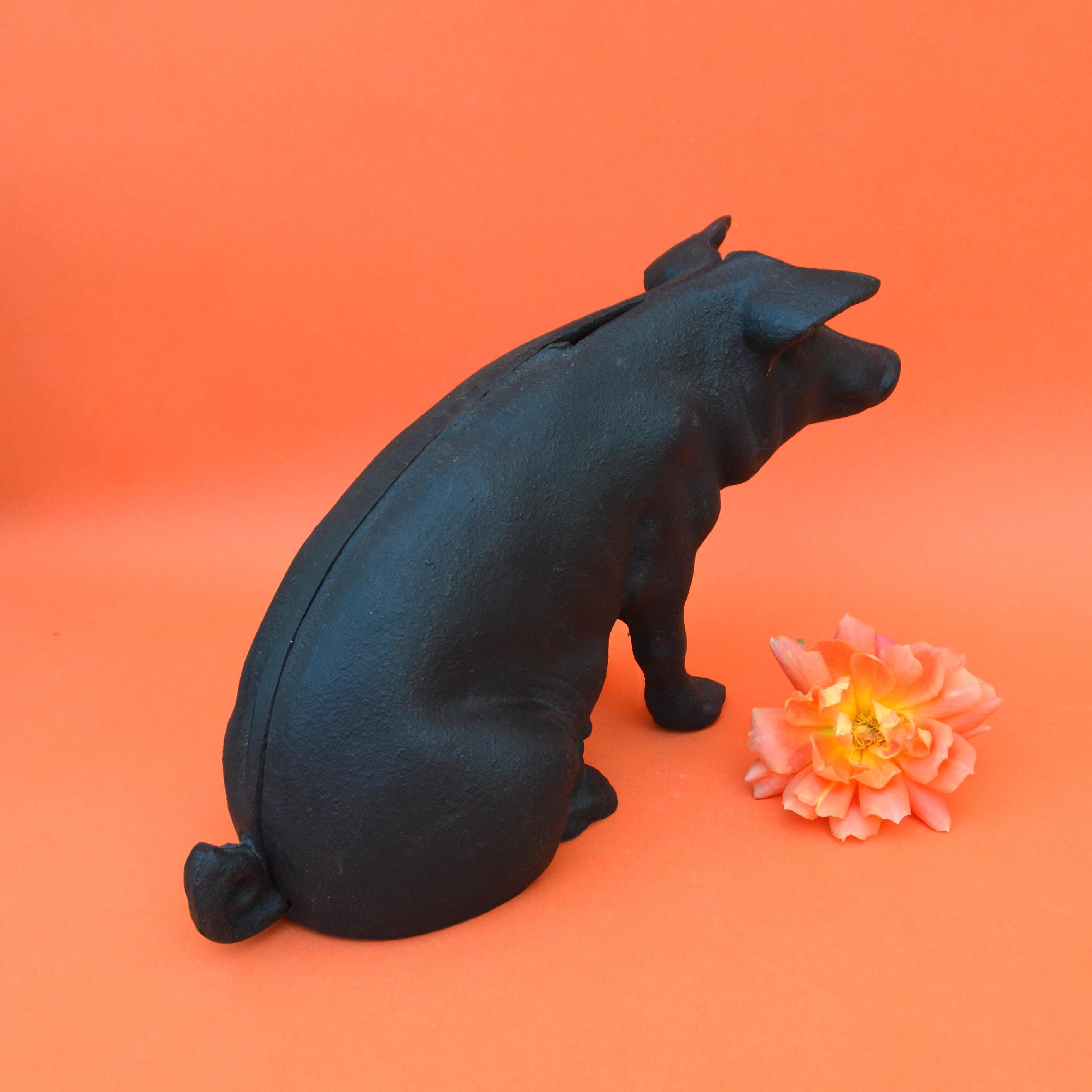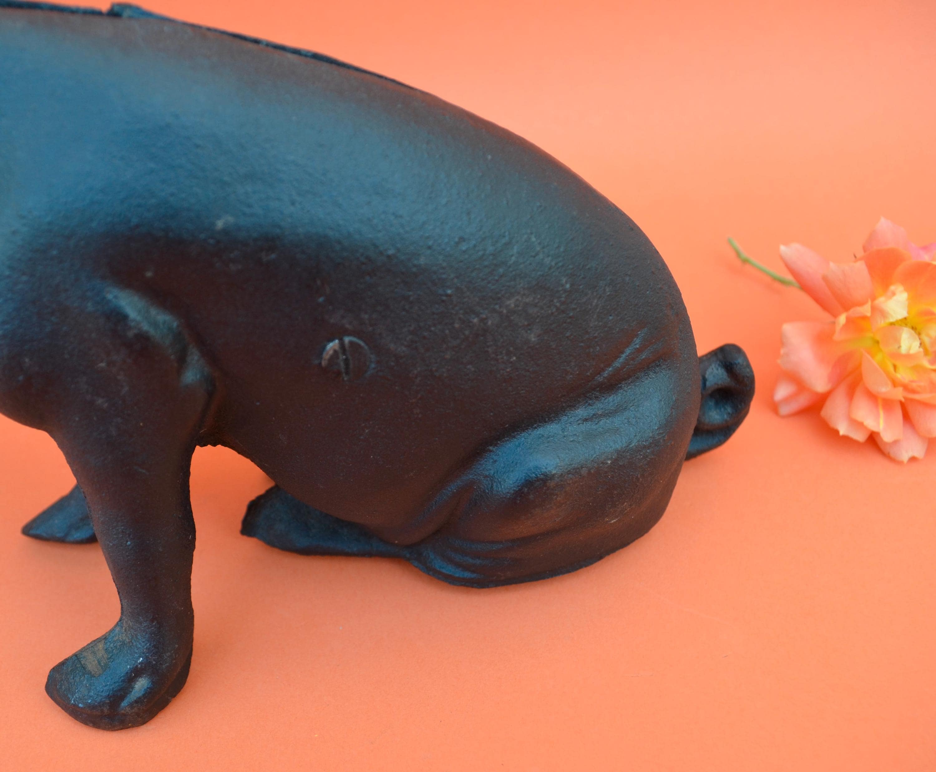 A fantastic vintage cast iron black piggy bank also doubles as a doorstop. She (yes, we think this is a sow!) obviously goes well with farmhouse decor but we'd love to see her in a contemporary setting as well. Once the pig is full of coins the screw can be undone and the bank opens up.