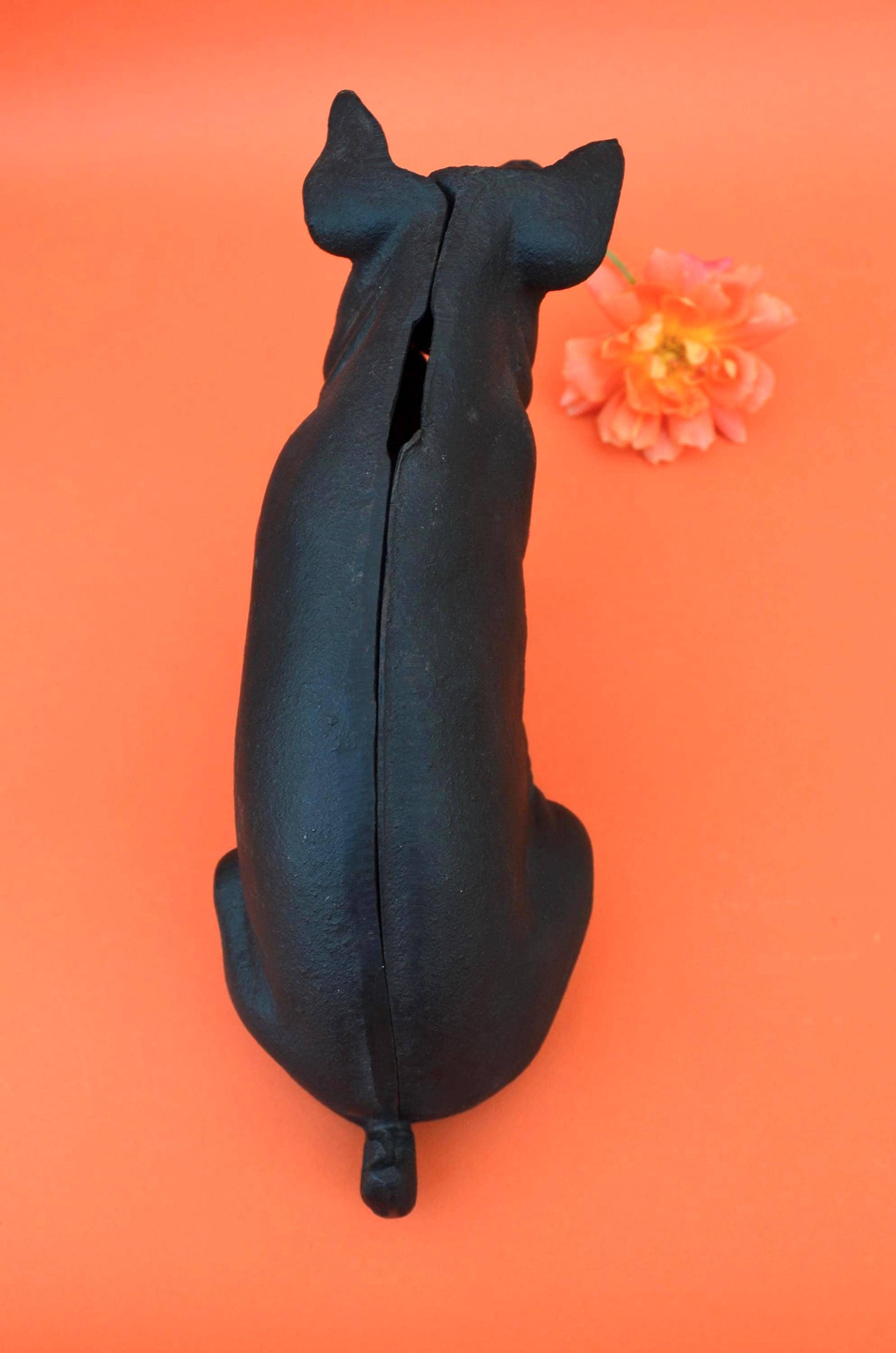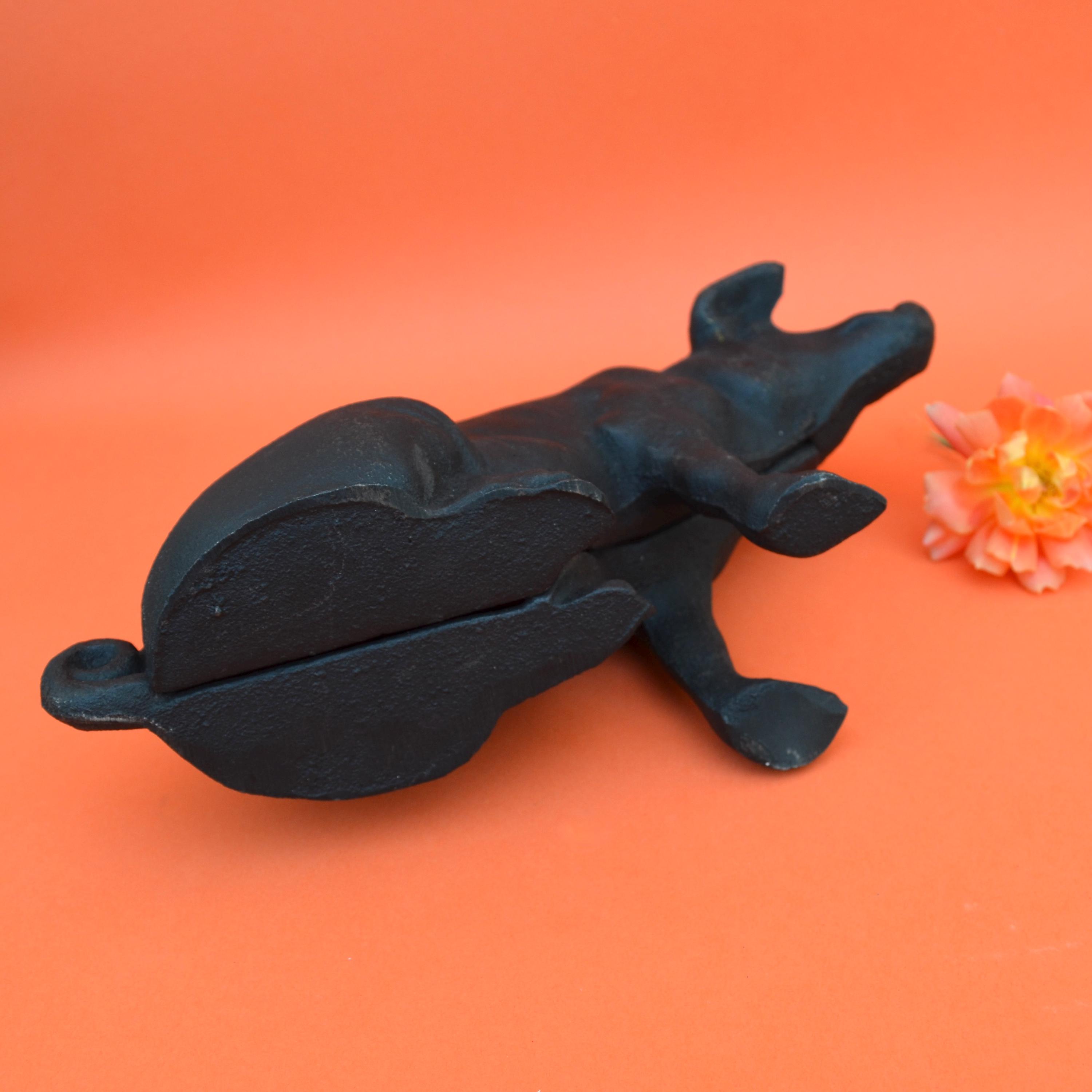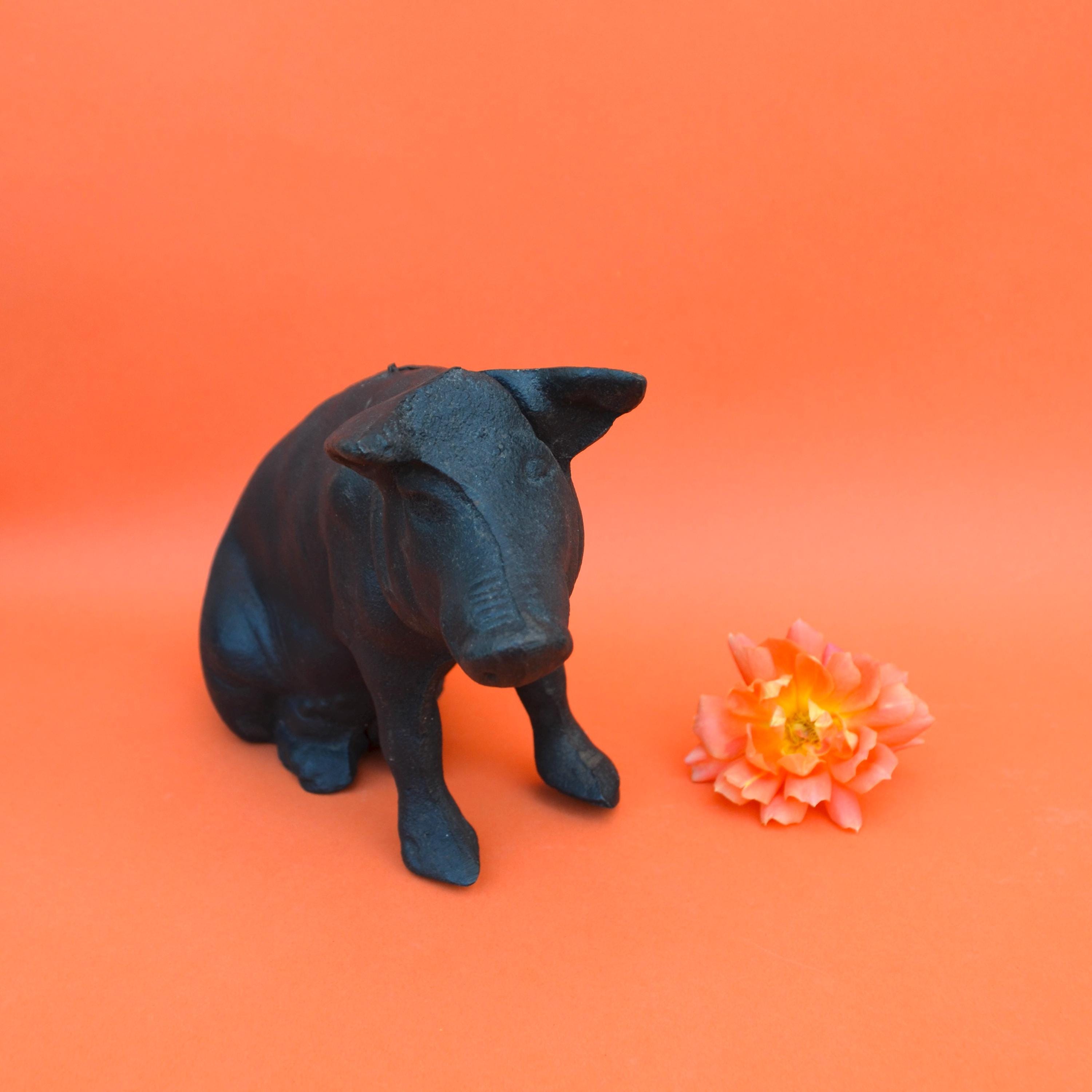 A fantastic vintage cast iron black piggy bank also doubles as a doorstop. She (yes, we think this is a sow!) obviously goes well with farmhouse decor but we'd love to see her in a contemporary setting as well. Once the pig is full of coins the screw can be undone and the bank opens up.
