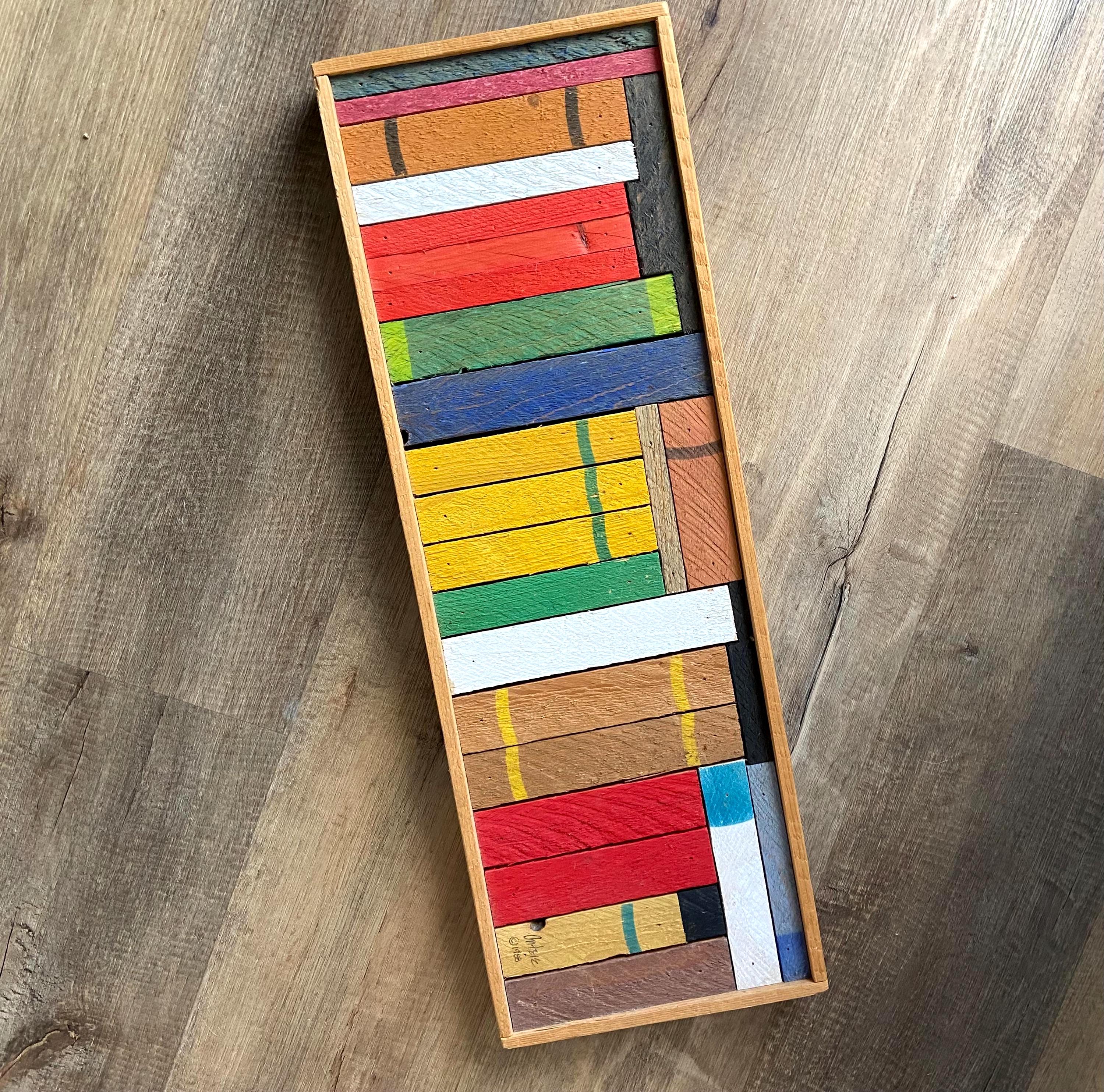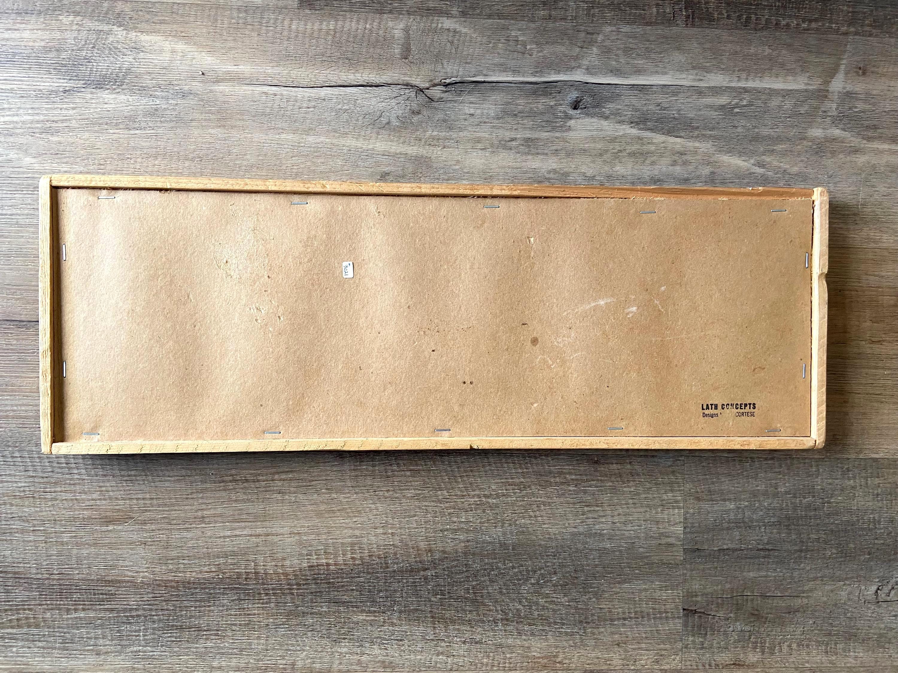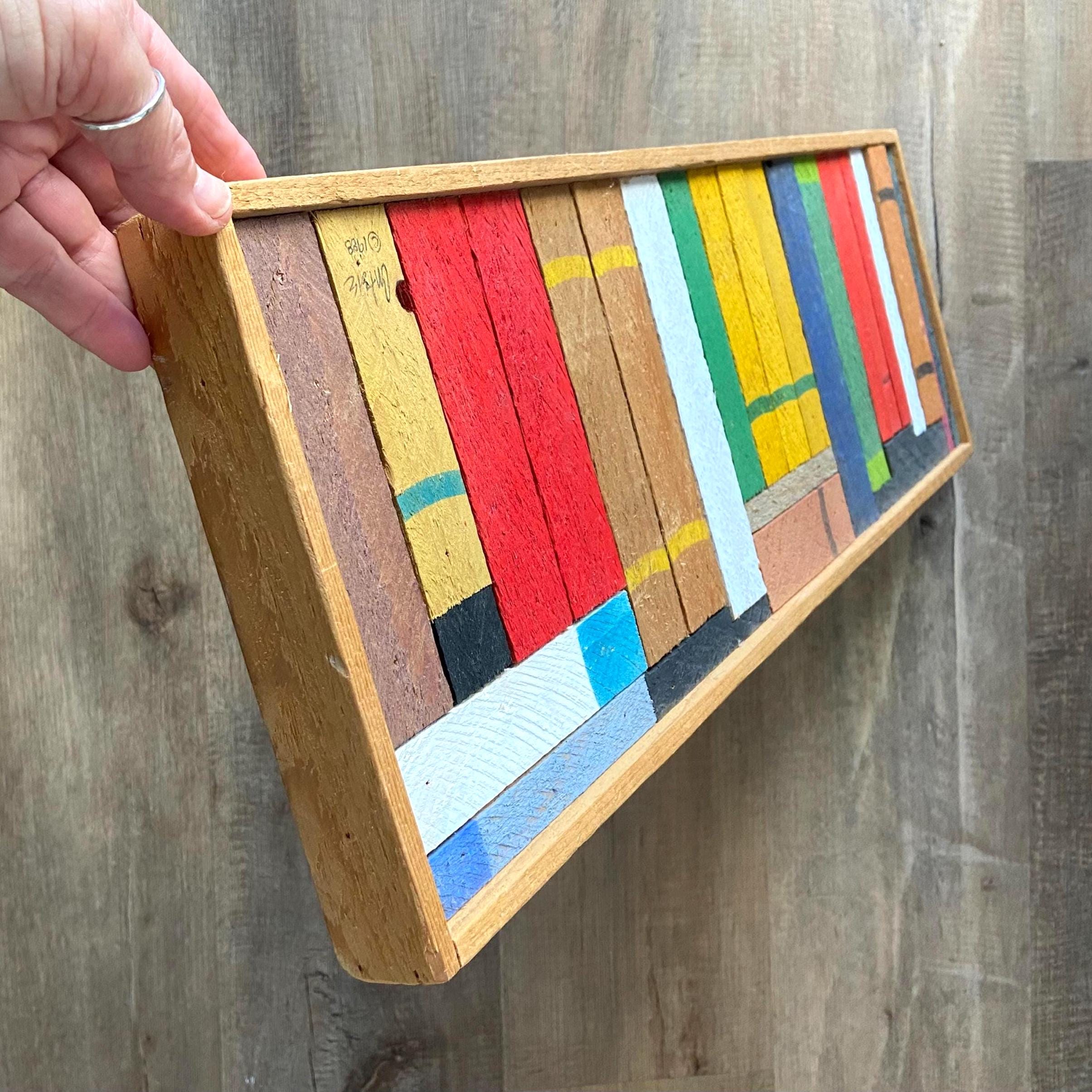 Amazing vintage wall art painted to look like books on a shelf. Hand painted rough hewn wood slats in a range of bright to subtle colors nailed in place. Signed “Cortese 1988” on the front and stamped “Lath Concepts” on the back. Artsy gift for the bibliophile on your list.