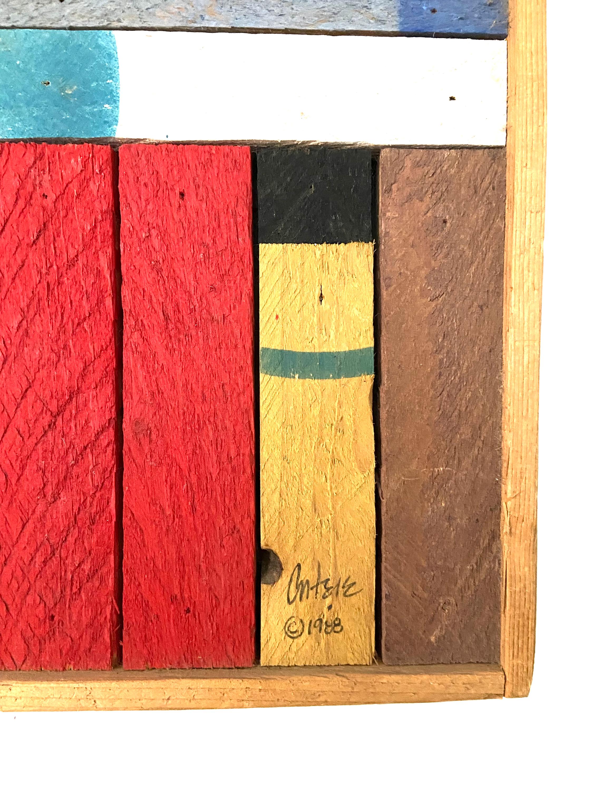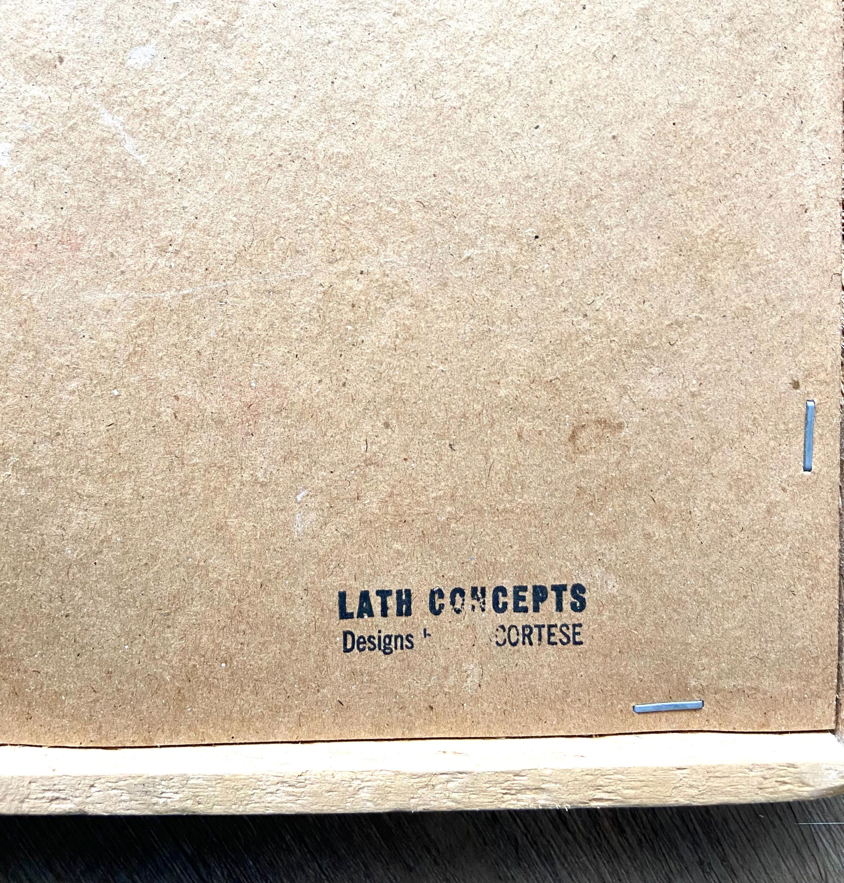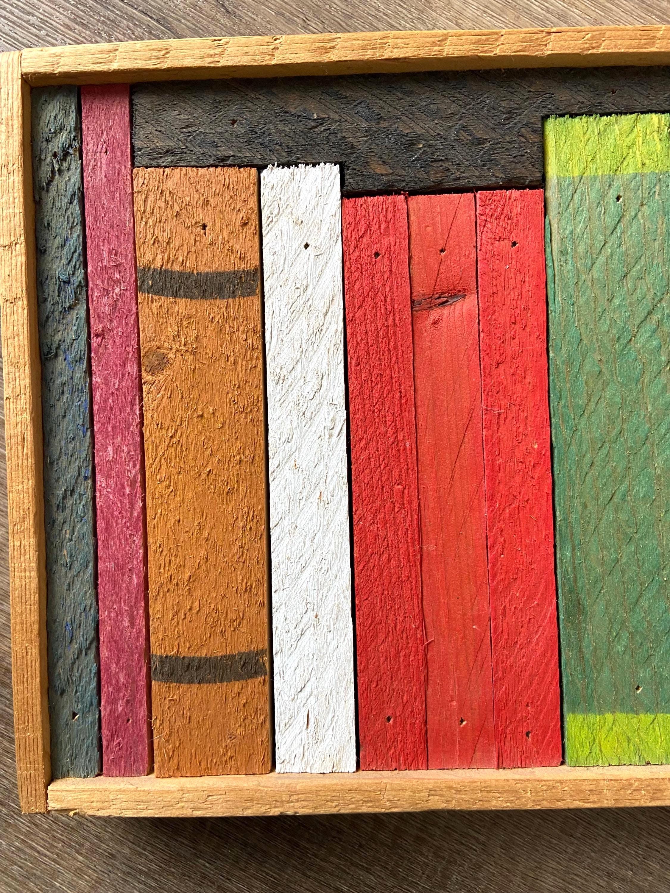Amazing vintage wall art painted to look like books on a shelf. Hand painted rough hewn wood slats in a range of bright to subtle colors nailed in place. Signed “Cortese 1988” on the front and stamped “Lath Concepts” on the back. Artsy gift for the bibliophile on your list.
