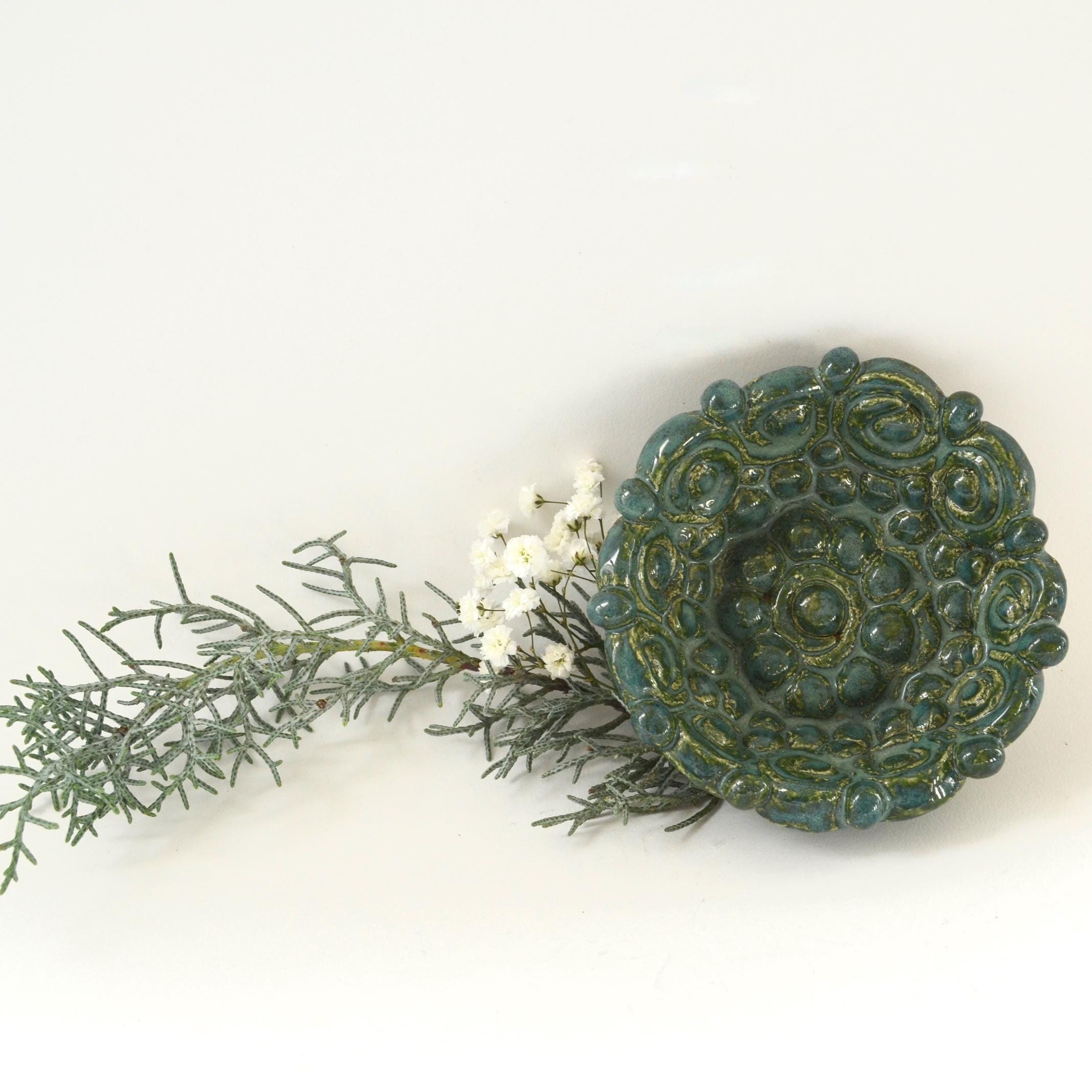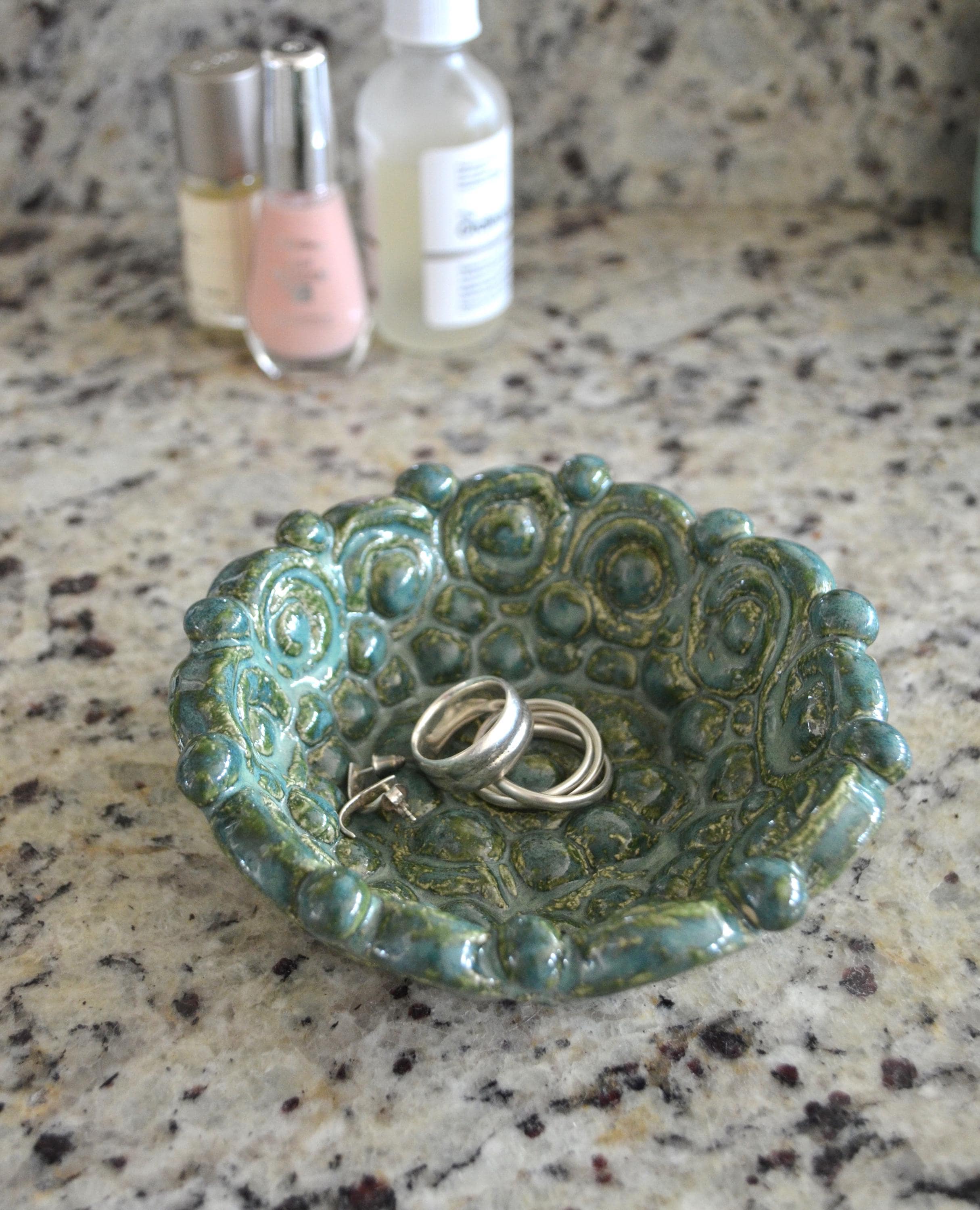 Vintage studio pottery small bowl in a glossy teal glaze with tan accents. So shiny it shimmers. Small coils of clay create a bubbly texture. We love weird one of a kind ceramic pieces made by hand so when we saw this, we knew it had to land here.