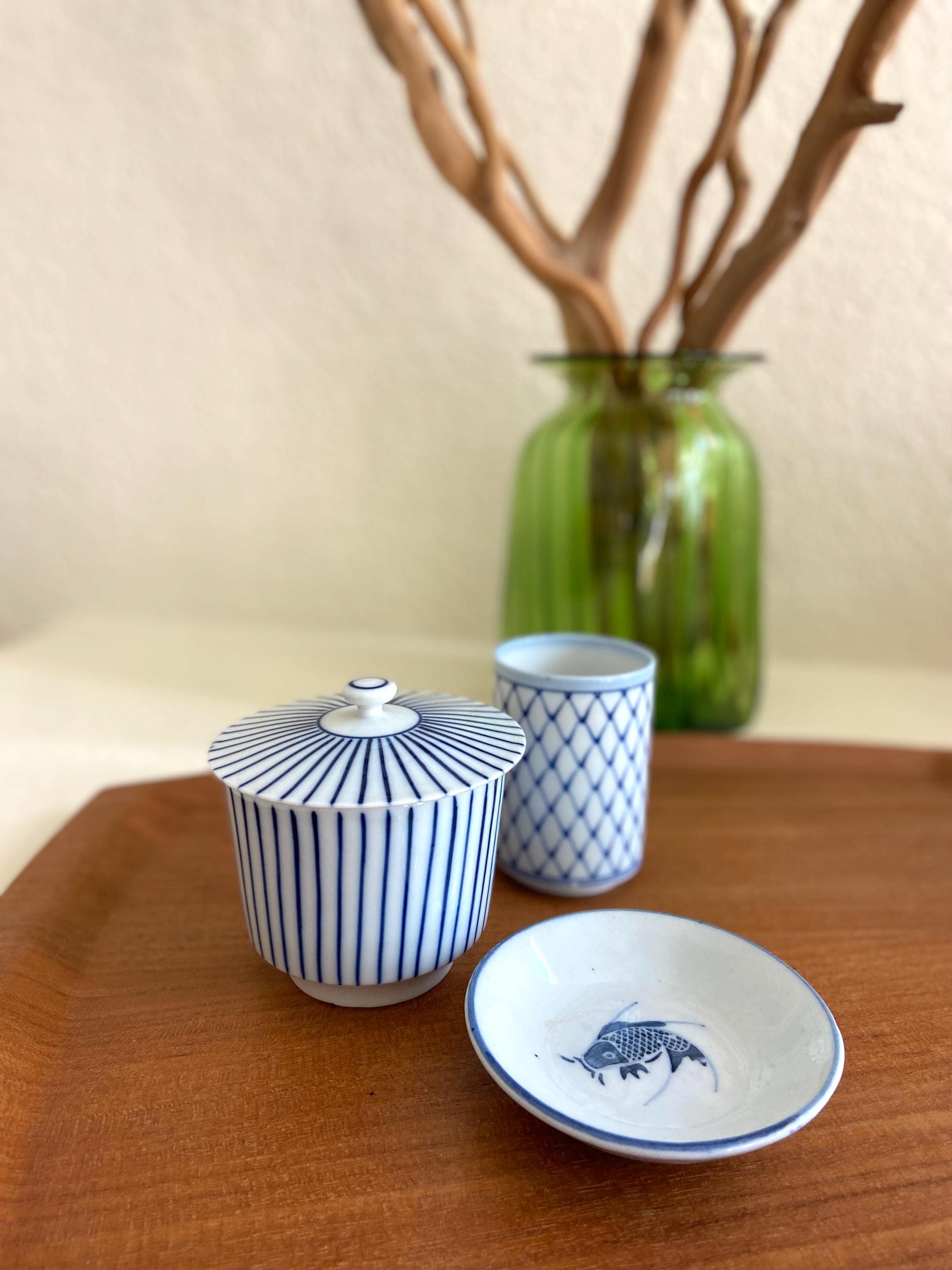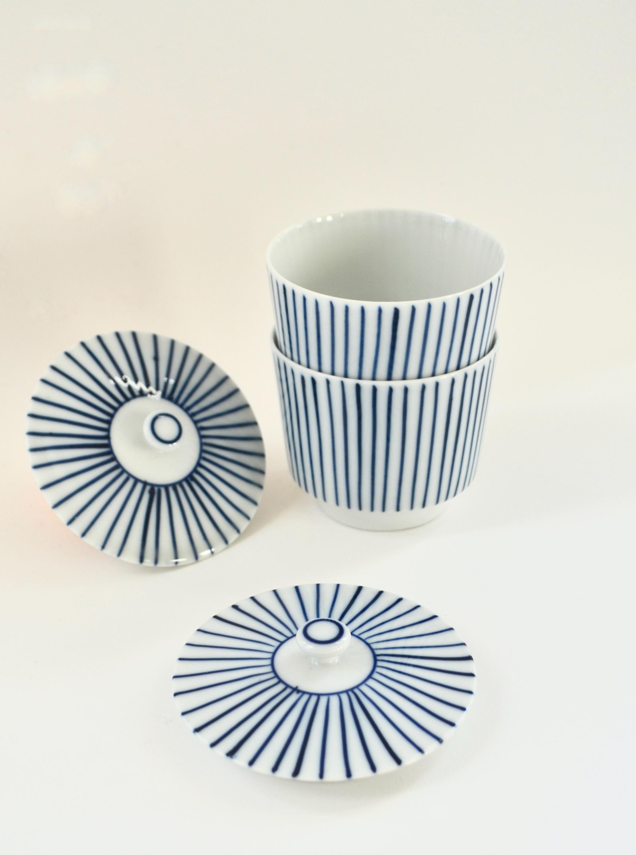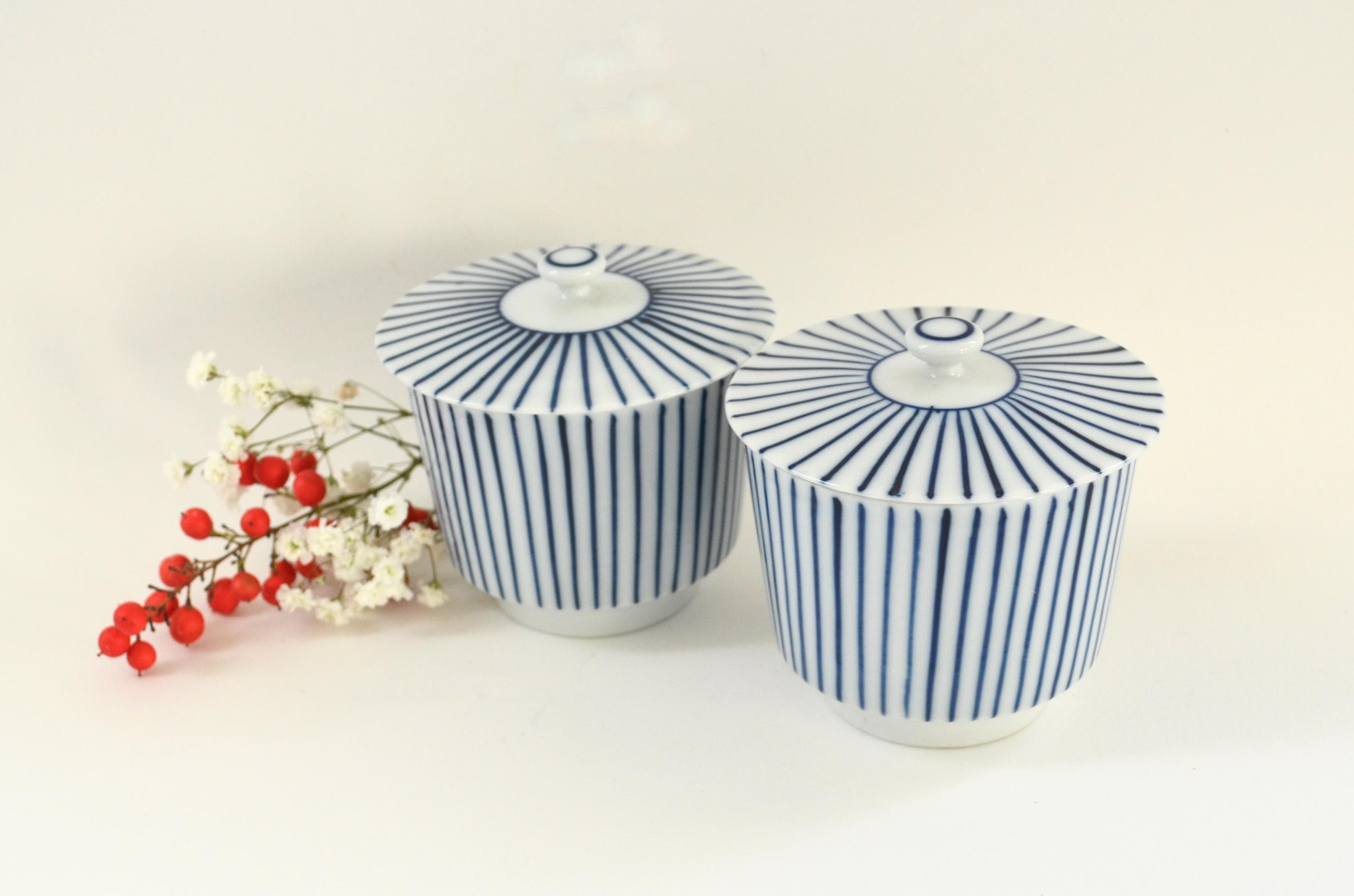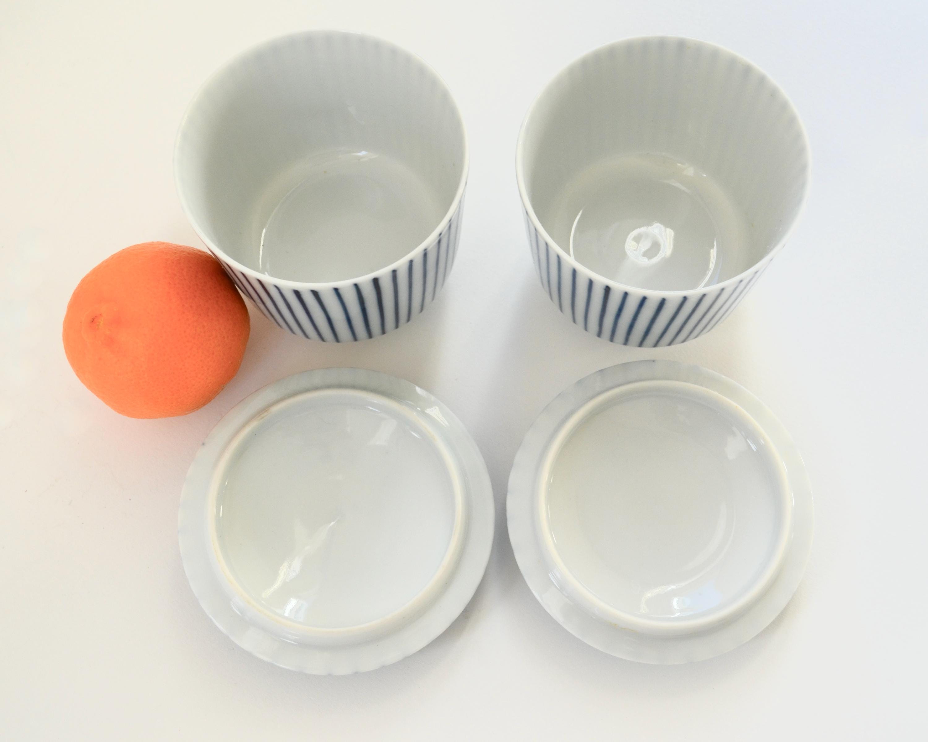 Vintage pair of covered tea bowls in a traditional blue and white stripe design, known as the "tokusa" pattern. These beauties can be used for serving tea, chawanmushi (steamed egg custard dish), desserts, or appetizers. We love the idea of using them as containers on your desk for organizing paper clips, and other small office supplies. Made of Japanese porcelain, the simple and elegant stripe pattern is regarded as a symbol of growth and prosperity in Japan.