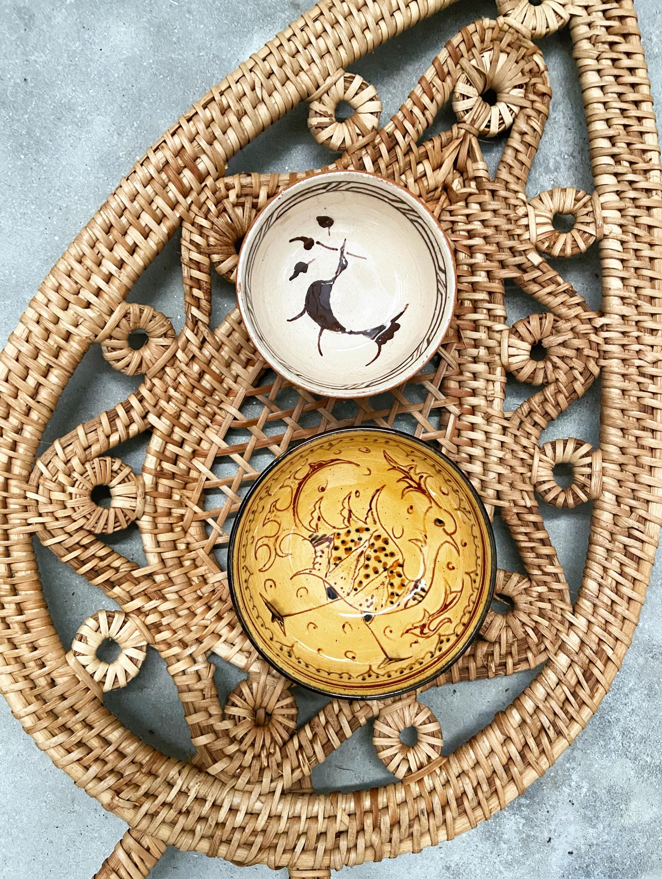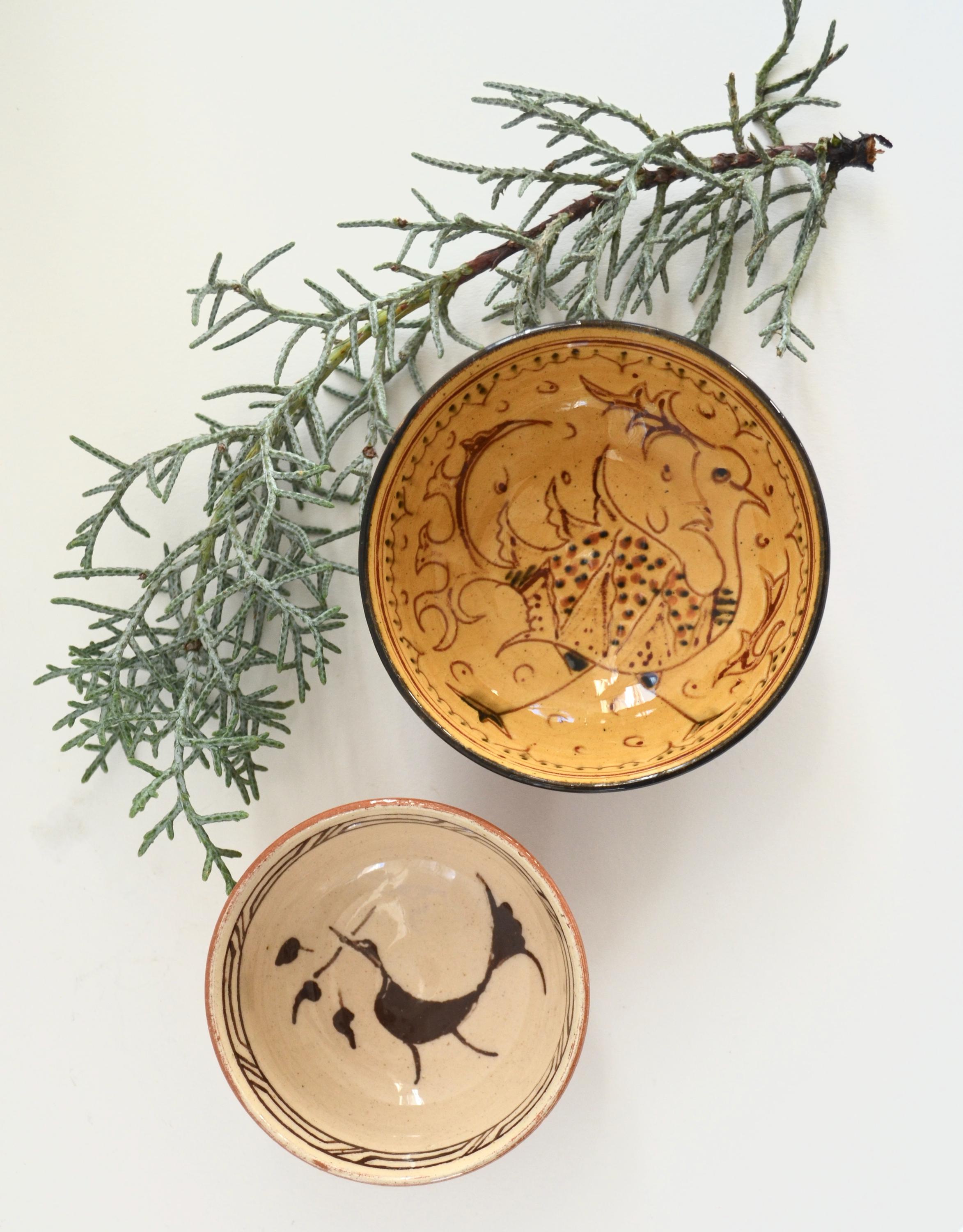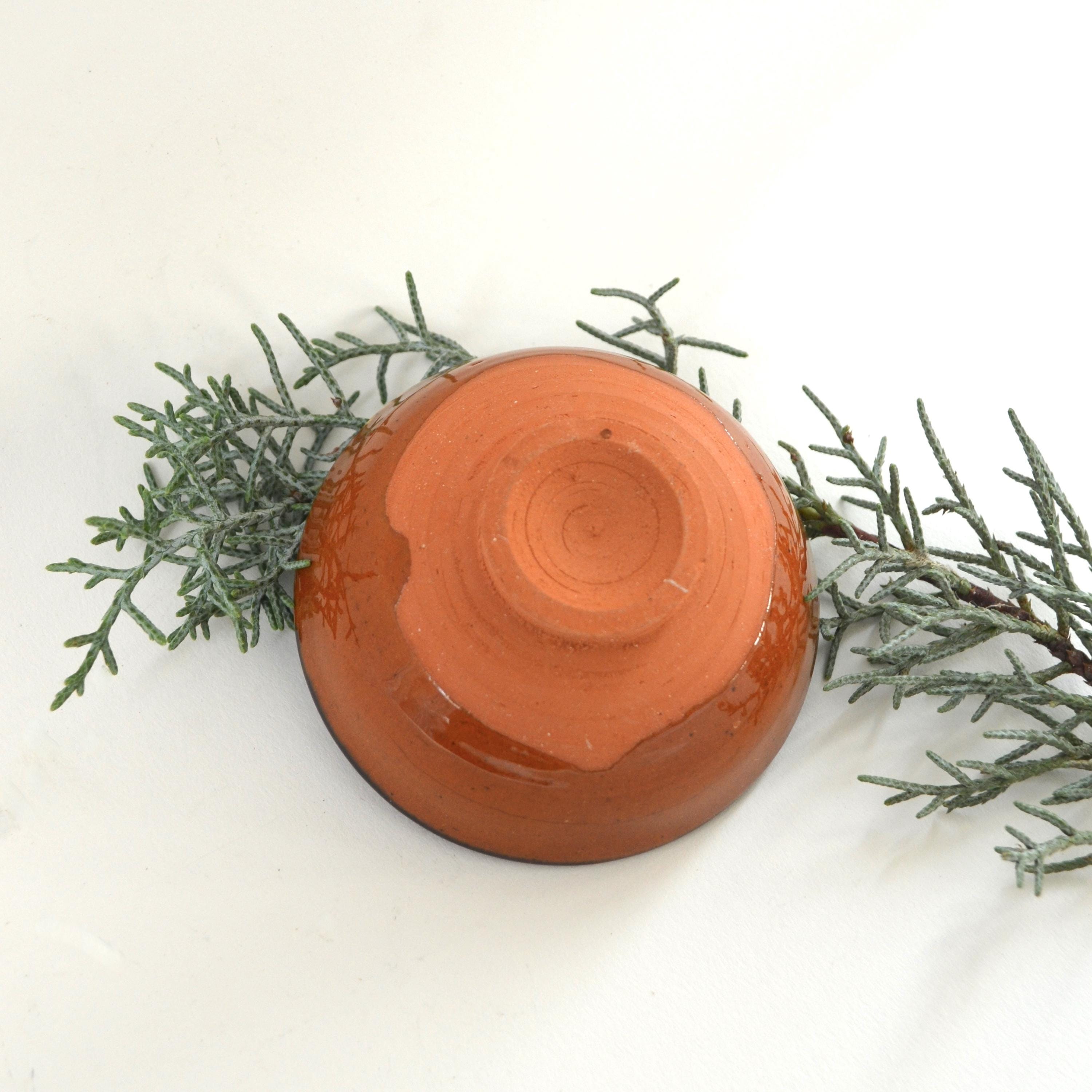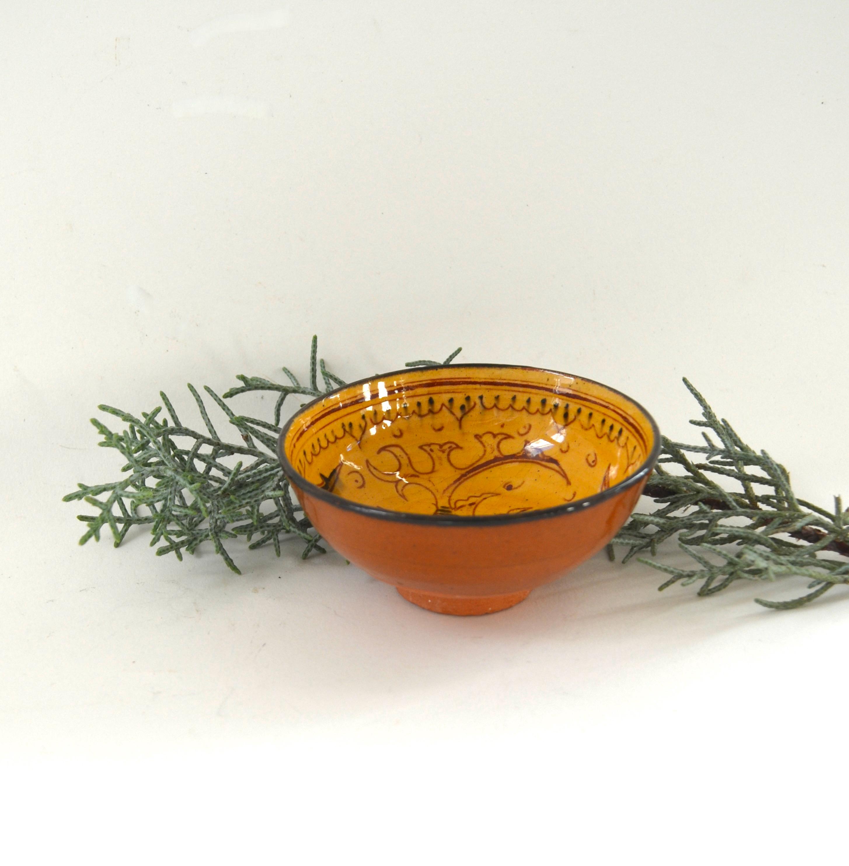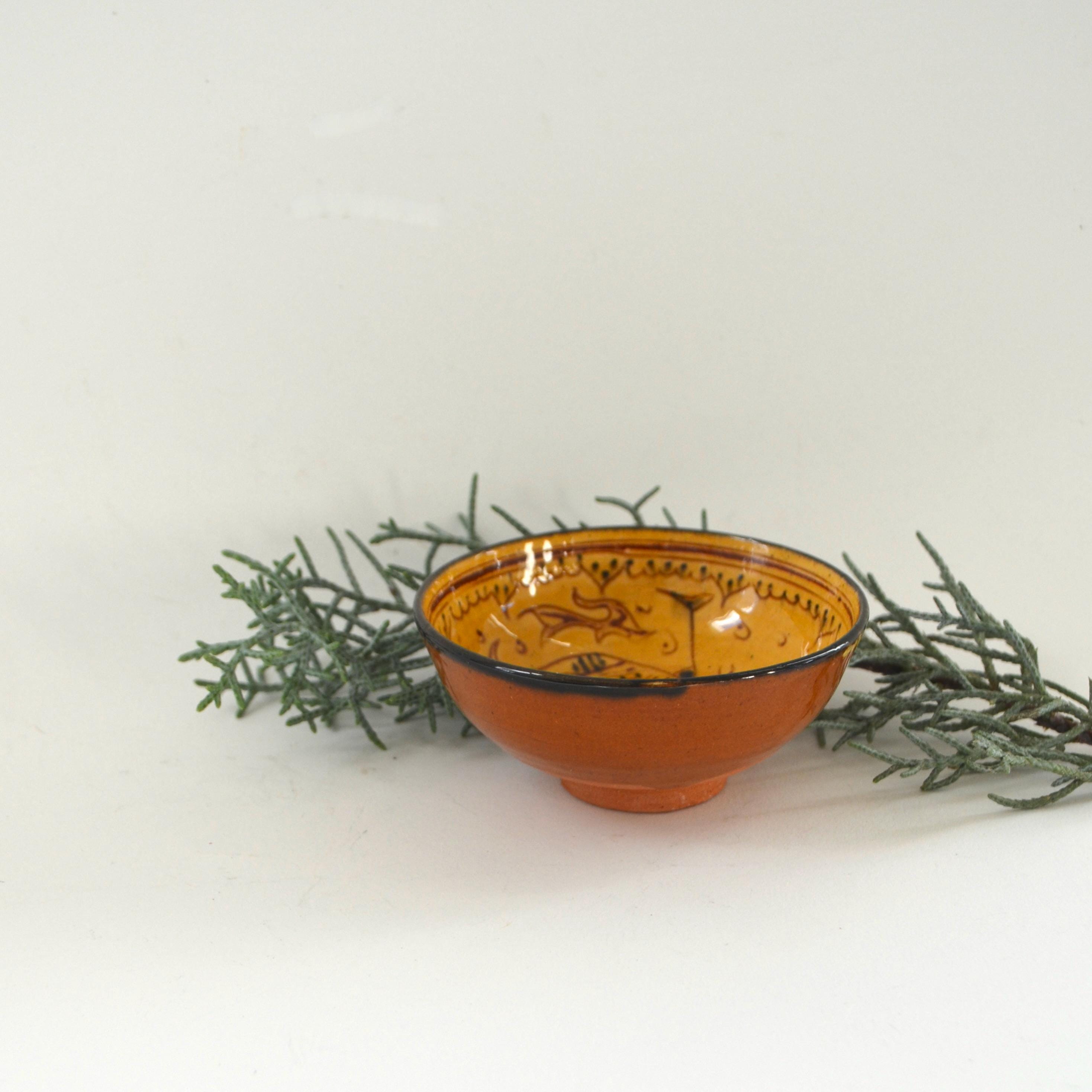 Vintage small pottery bowl with an amazing stylized bird design. Mustard yellow glaze over terra cotta with dark brown accents. Unsigned. Special little something for a special someone in your life.