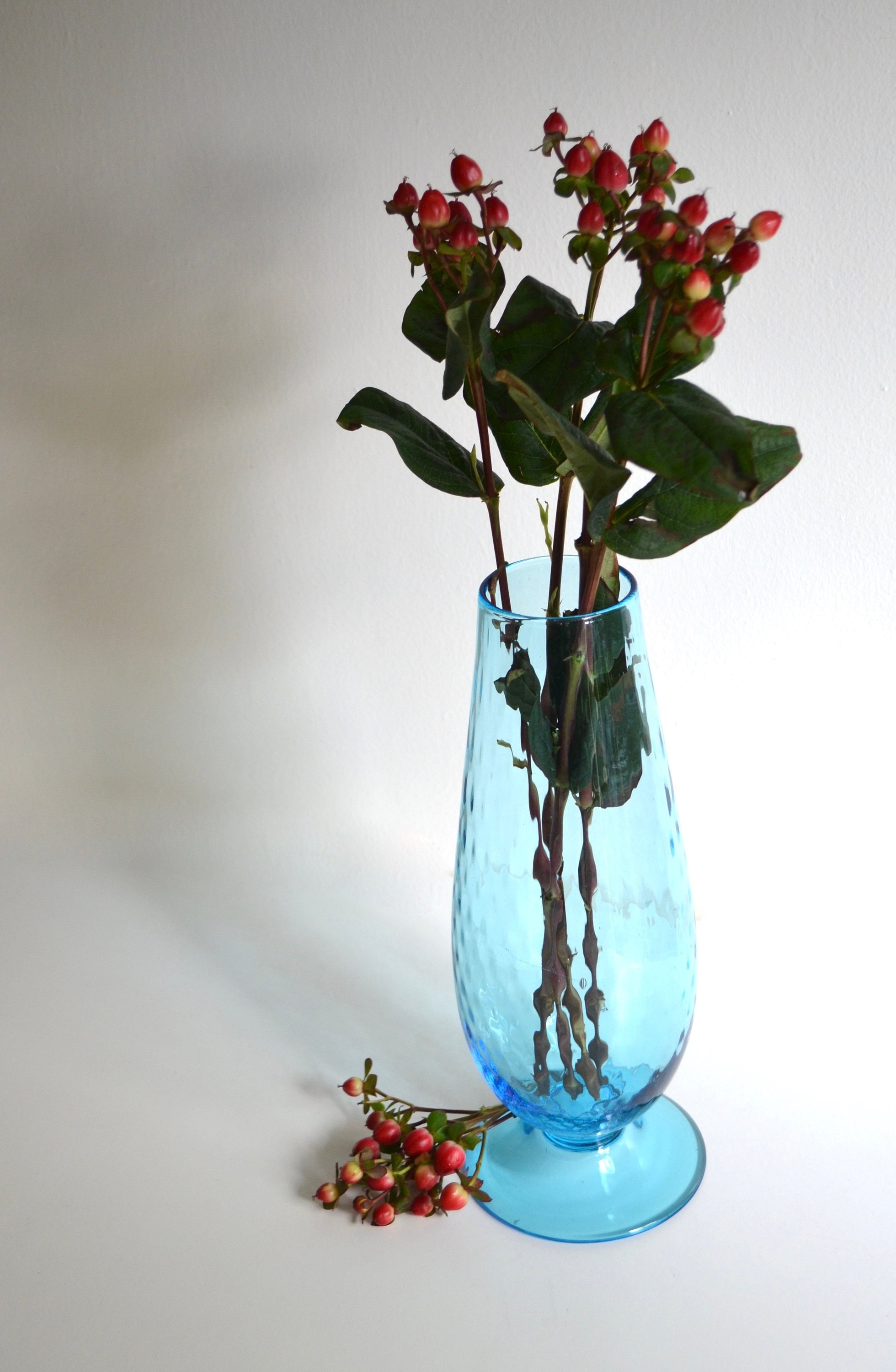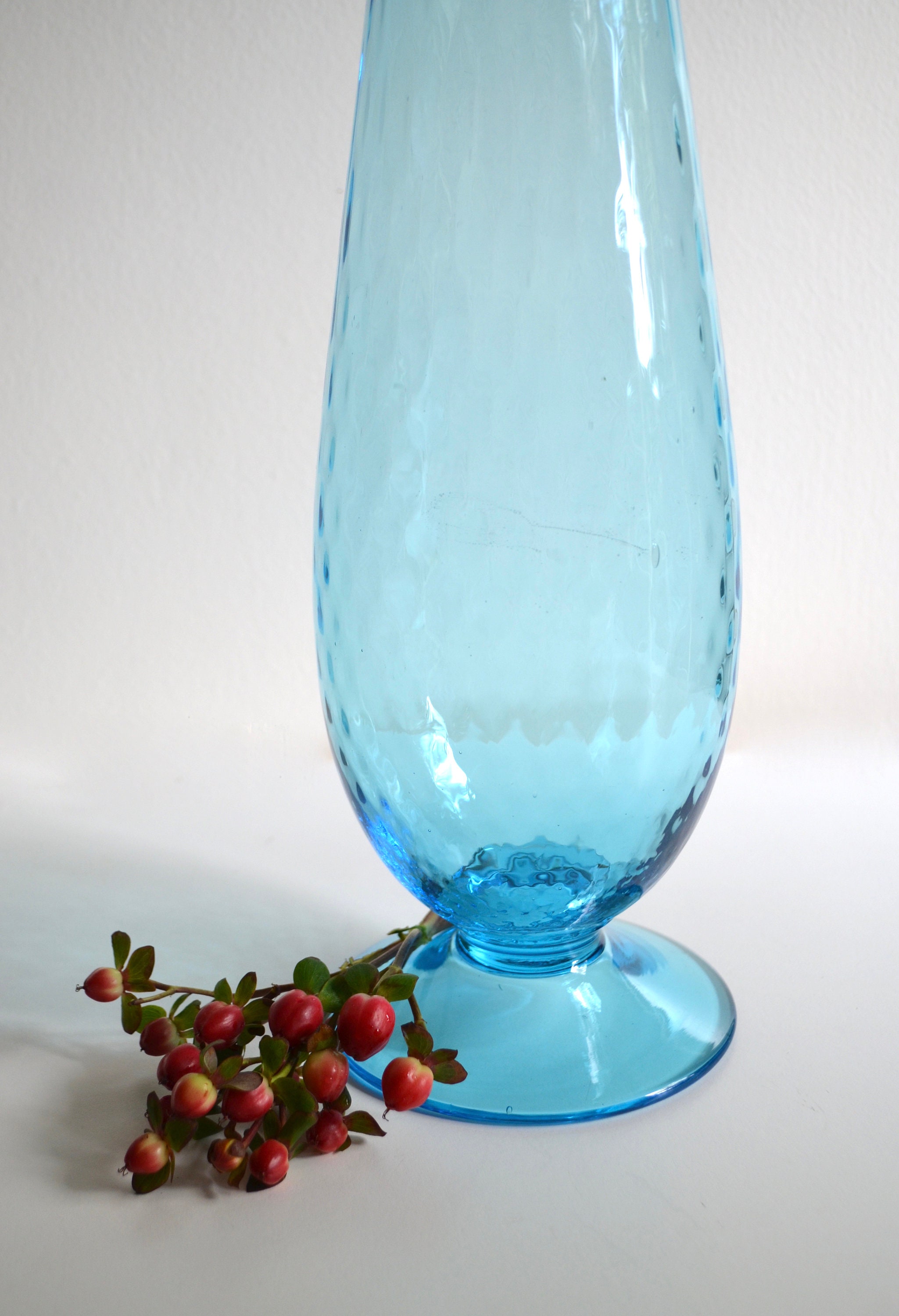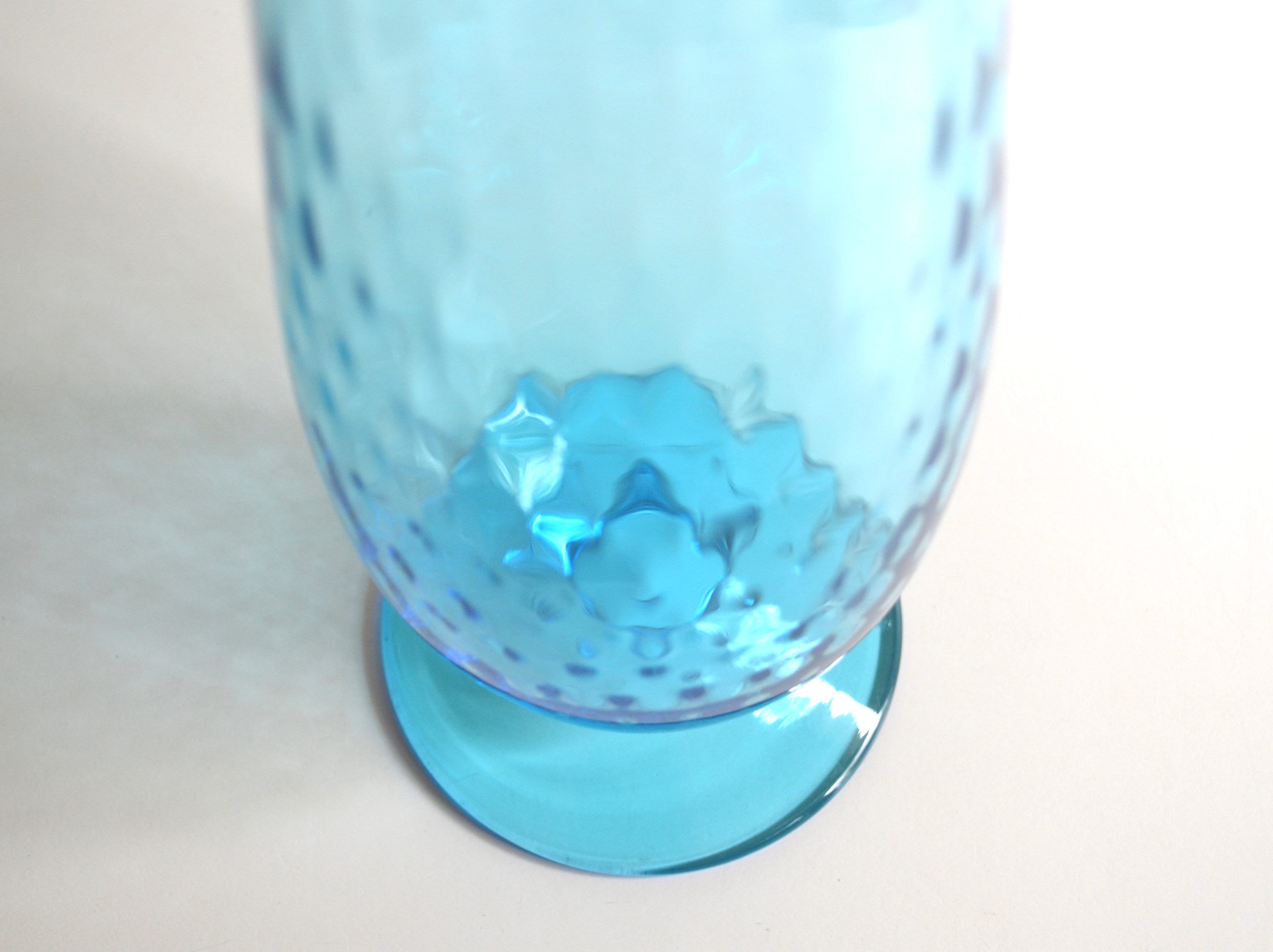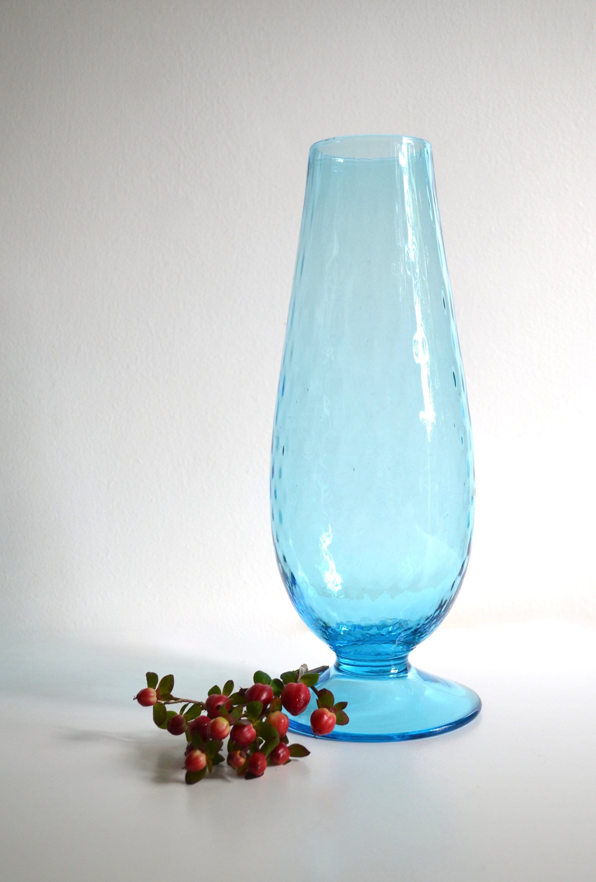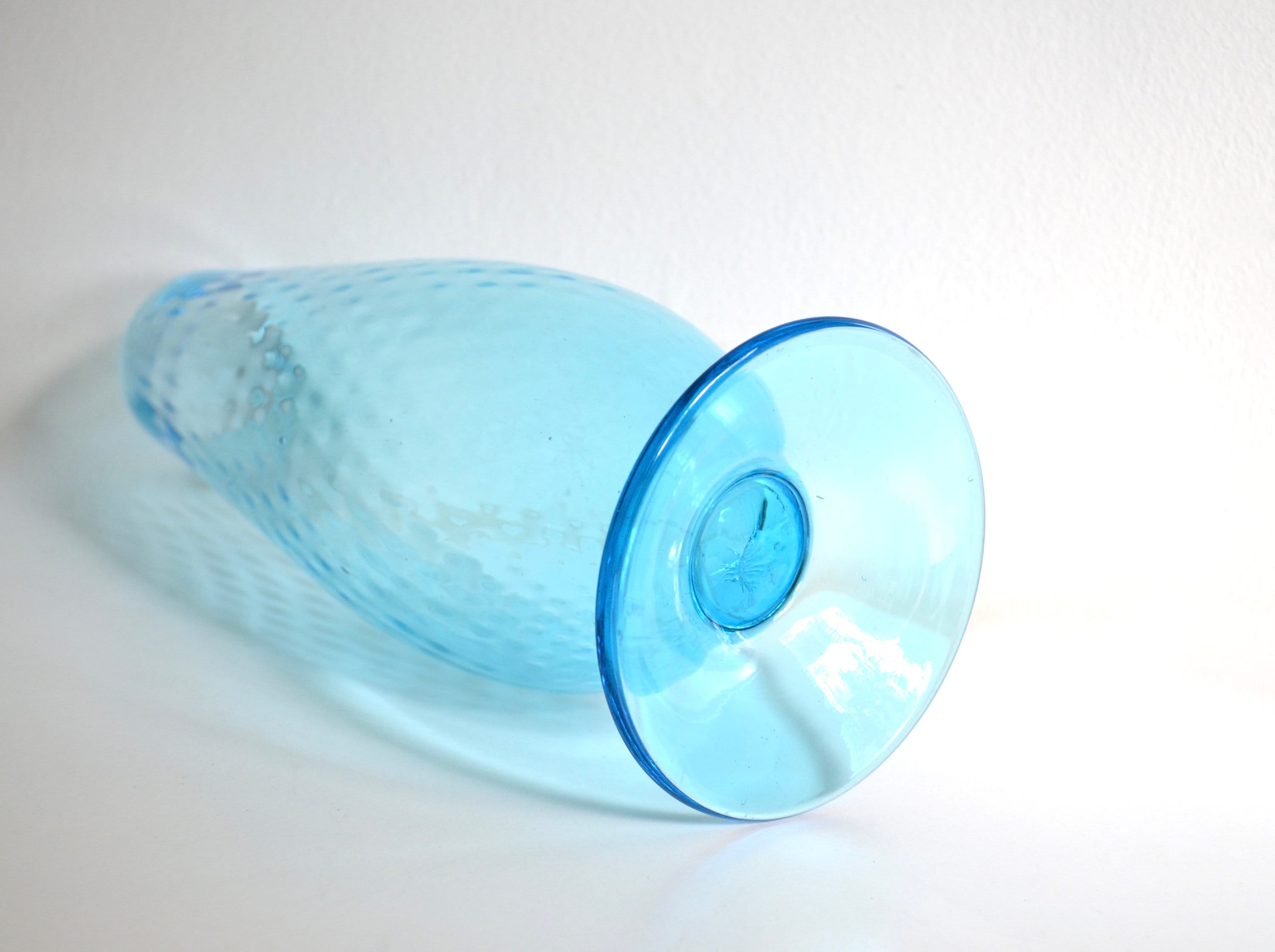 Aqua blue is a soothing color for the home especially in glass. This tall handblown footed vase has small air bubbles throughout. There is a scratch that runs across the widest part of the vase as seen in photo 3 but otherwise it's a stunning piece. Fill with baby pine cones for the holidays or seashells for the summer.